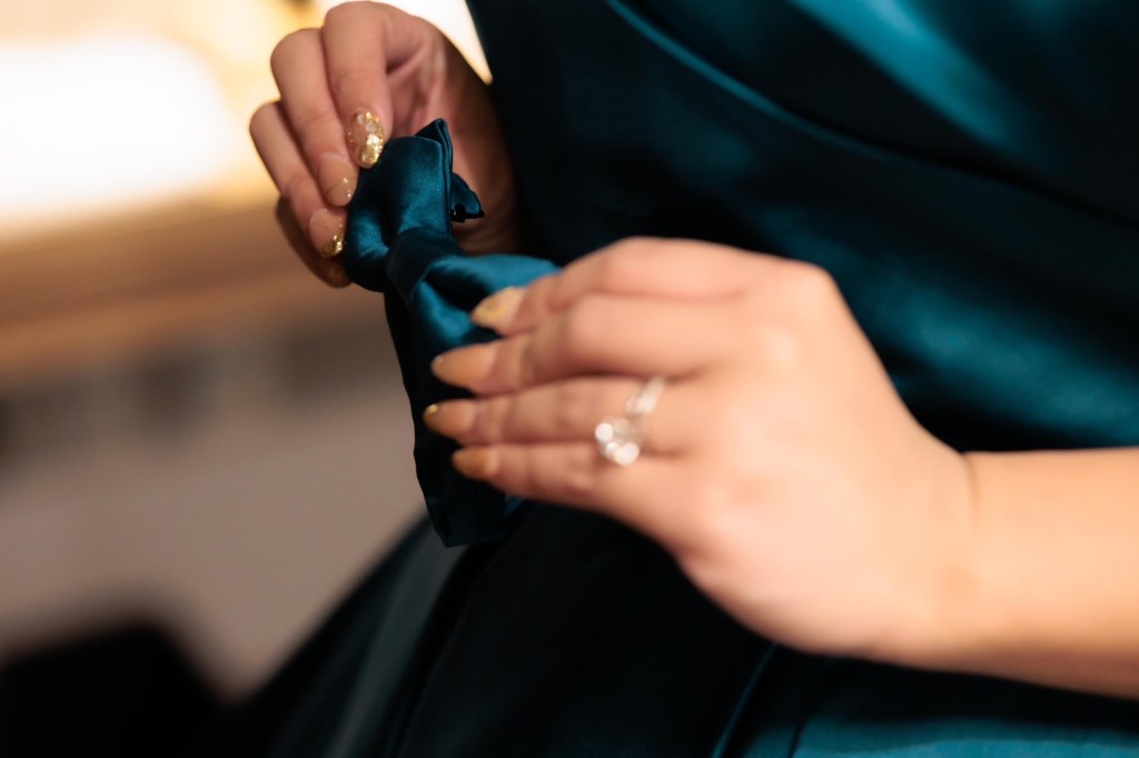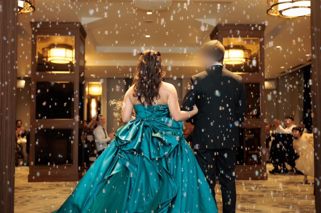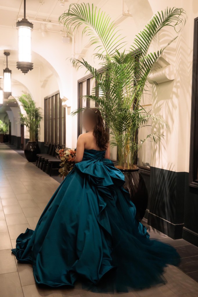 動くたびにふわっと揺れて、どこから見ても華やかさ抜群の一着です。バックリボン付き。