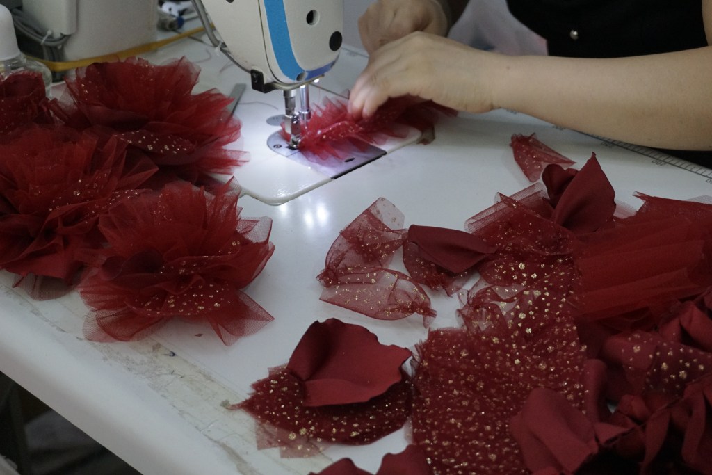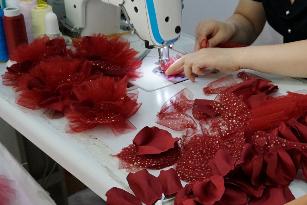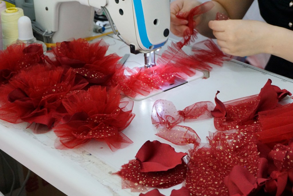こちらは光沢のある赤のグリッター生地に、柔らかなチュールを重ねて立体感を出しているところです。
