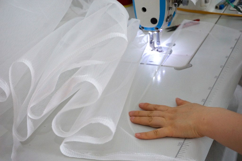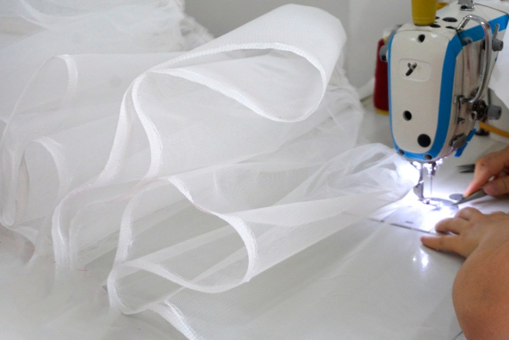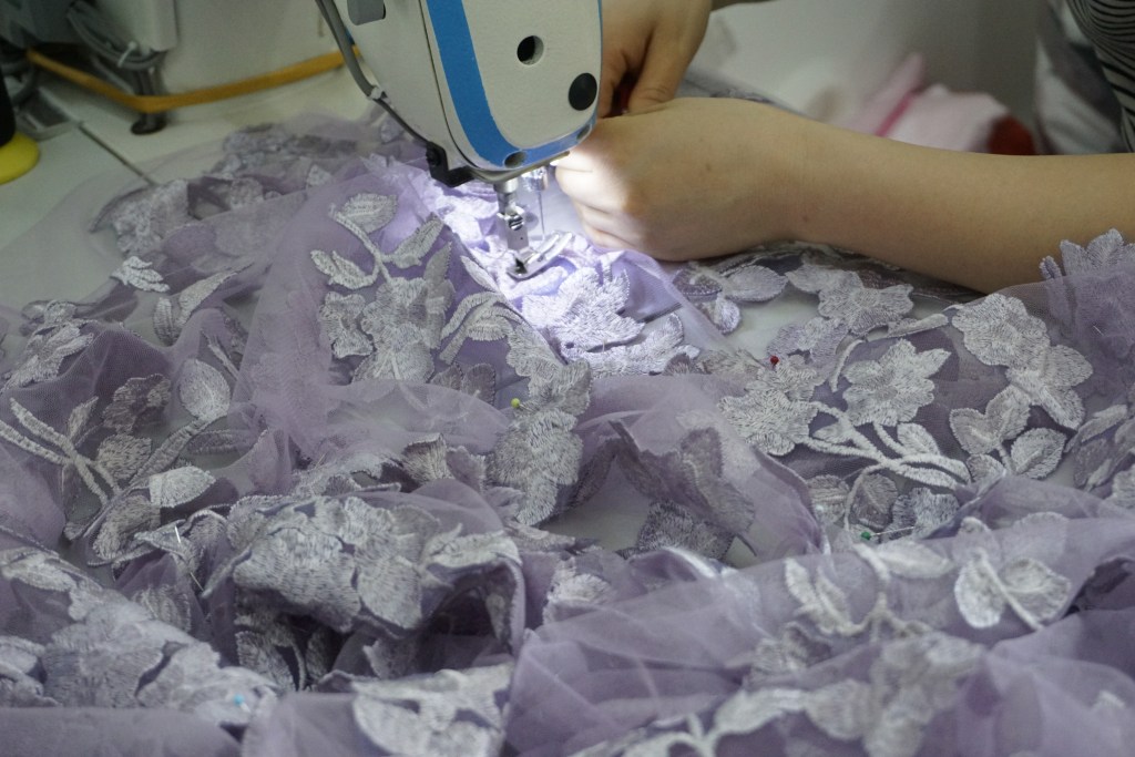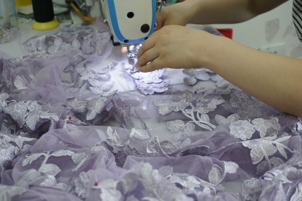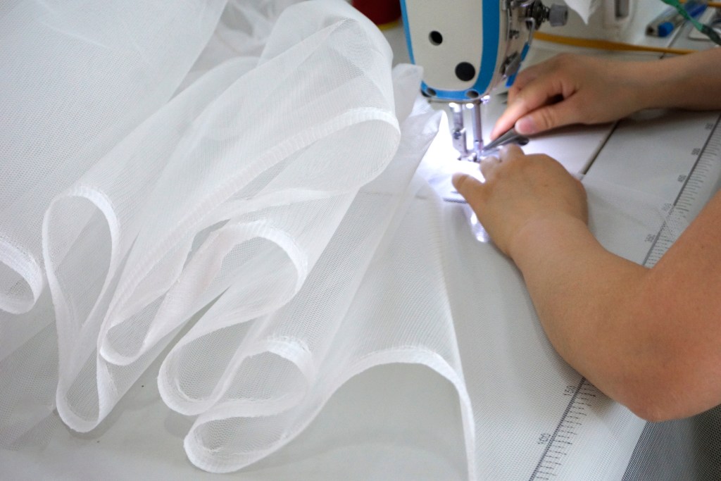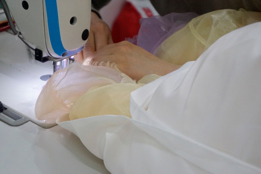 ベースとなる白いサテンの上に、数種類のカラーのチュールを一層ずつ丁寧に重ねていく作業です。