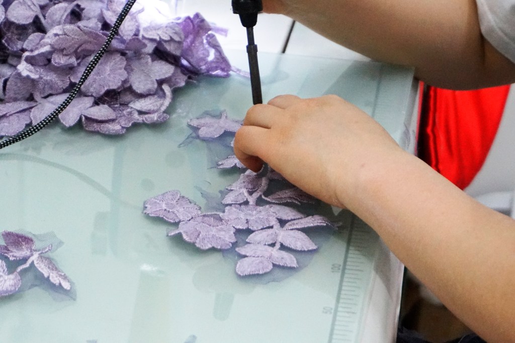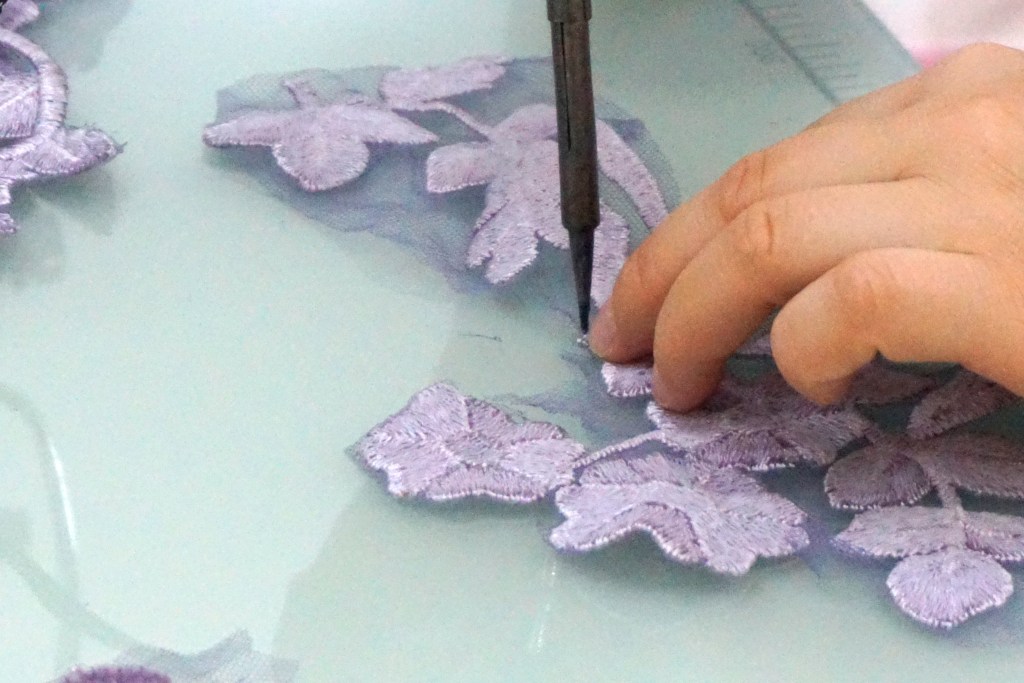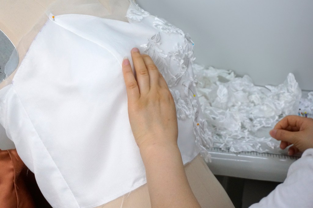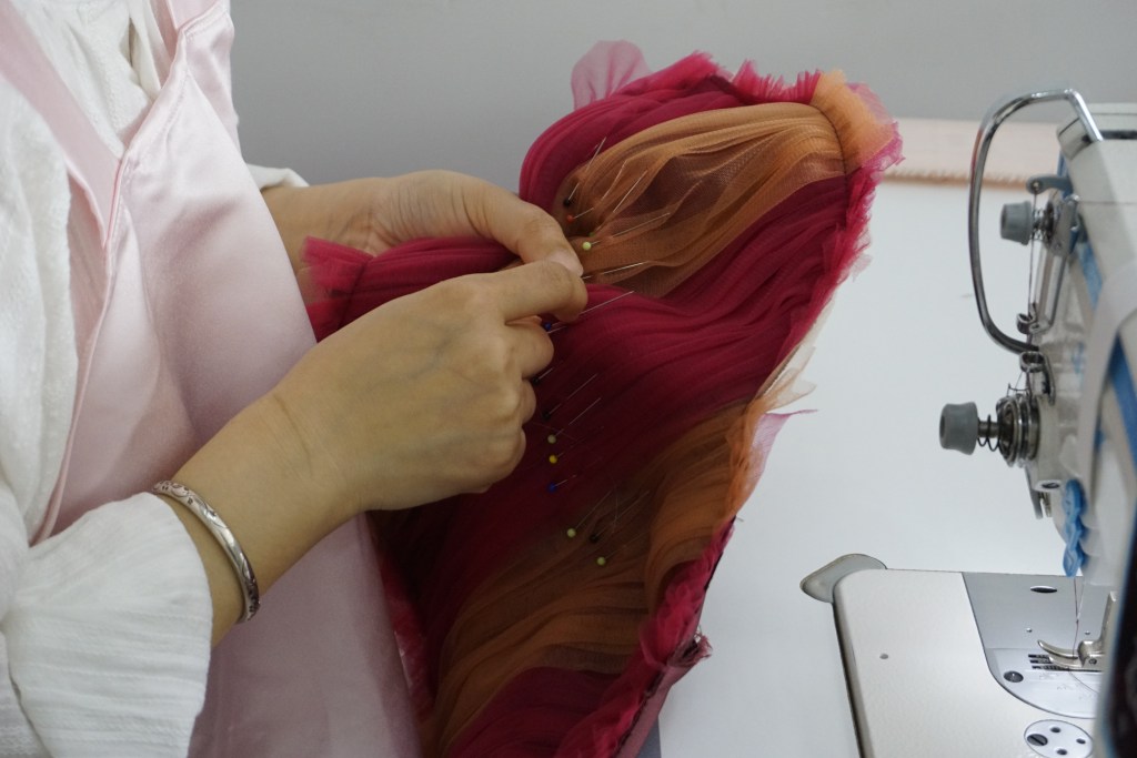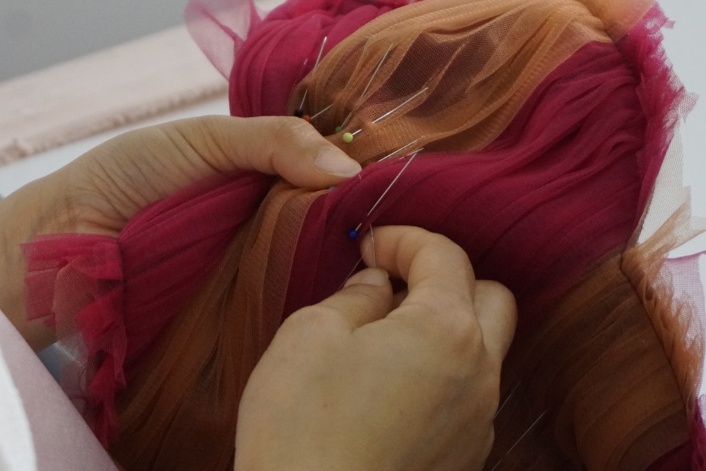シンプルなビスチェとは対象に、アンシンメトリーで立体的に広がる