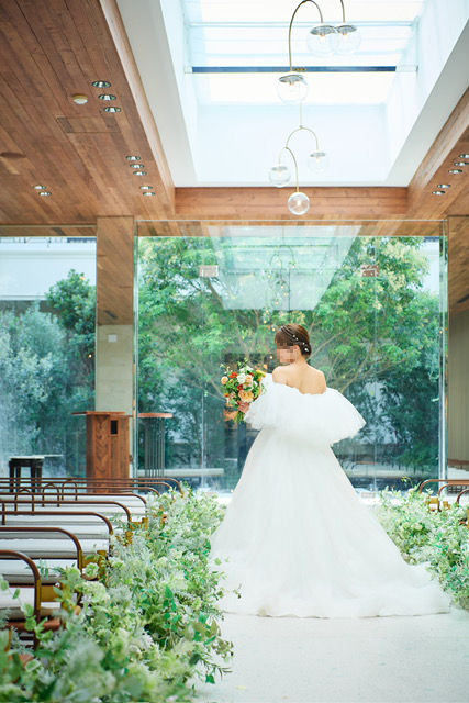 オフショルダーのデザインが首元を美しく見せ、ボリュームのあるスカートはオーガンジーを重ね、