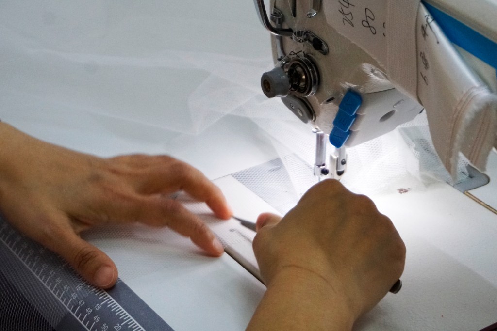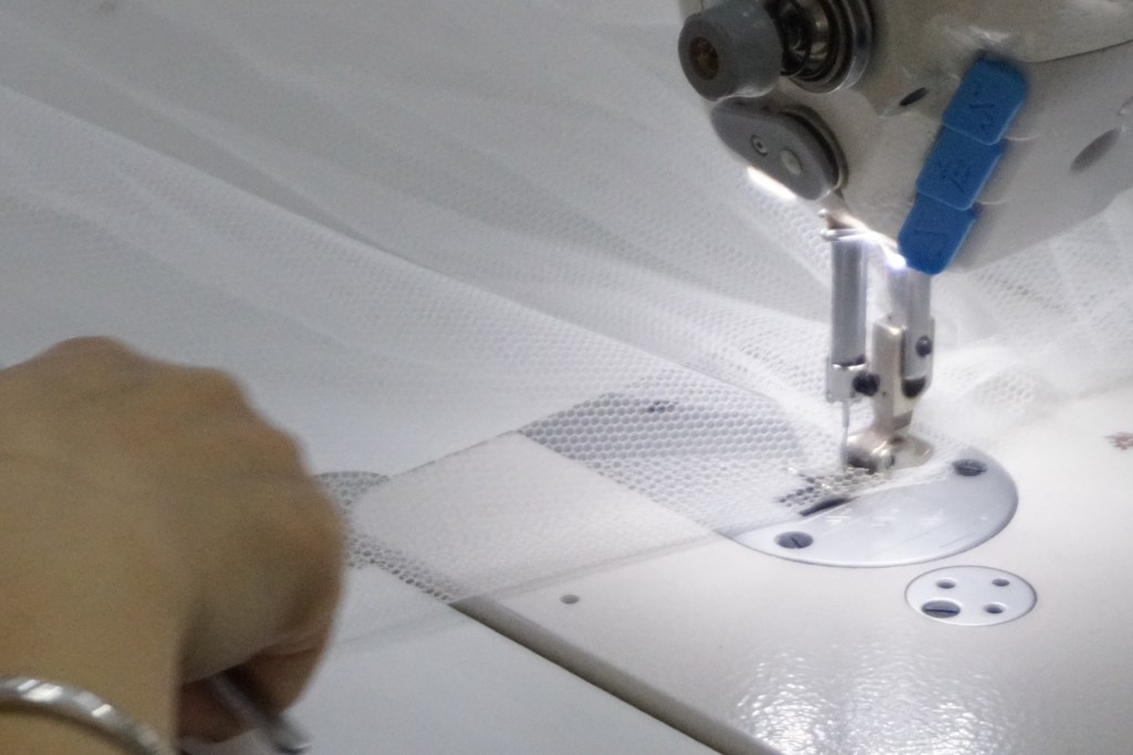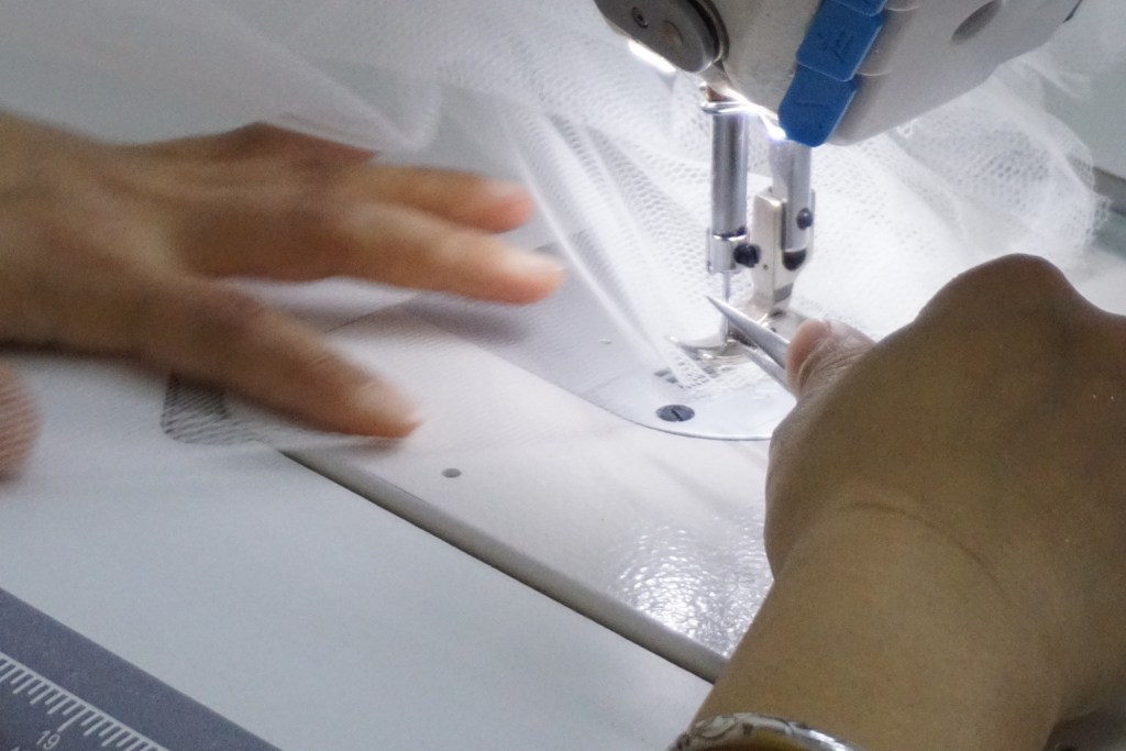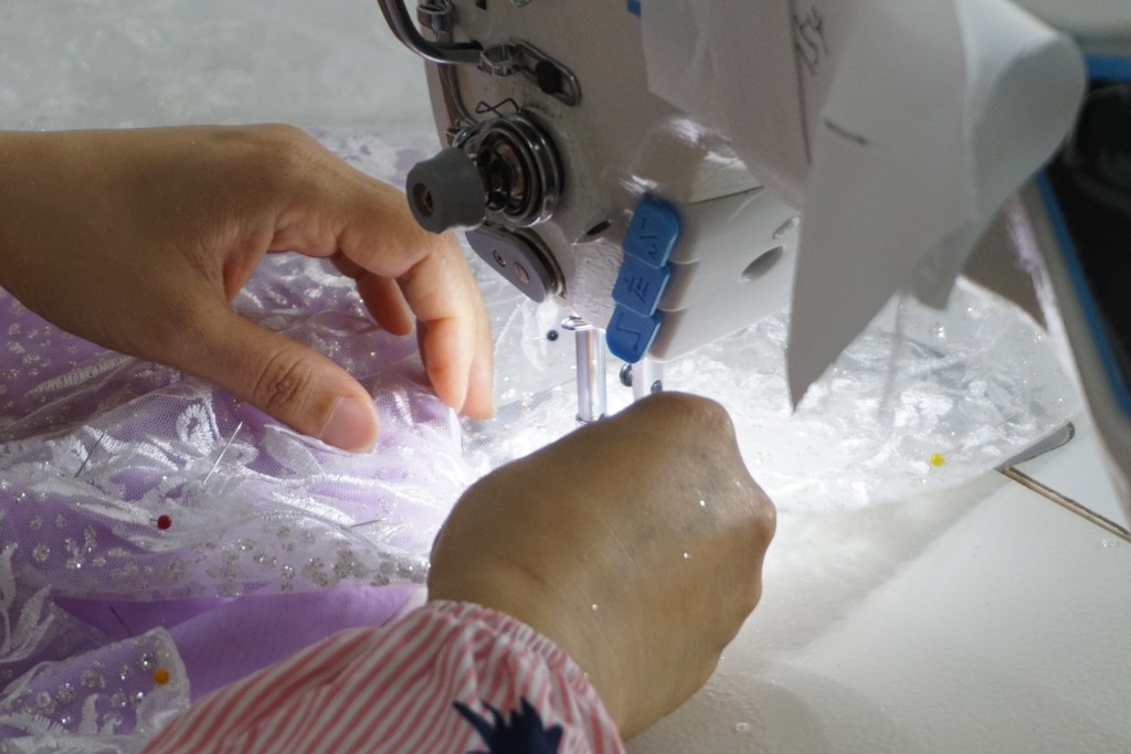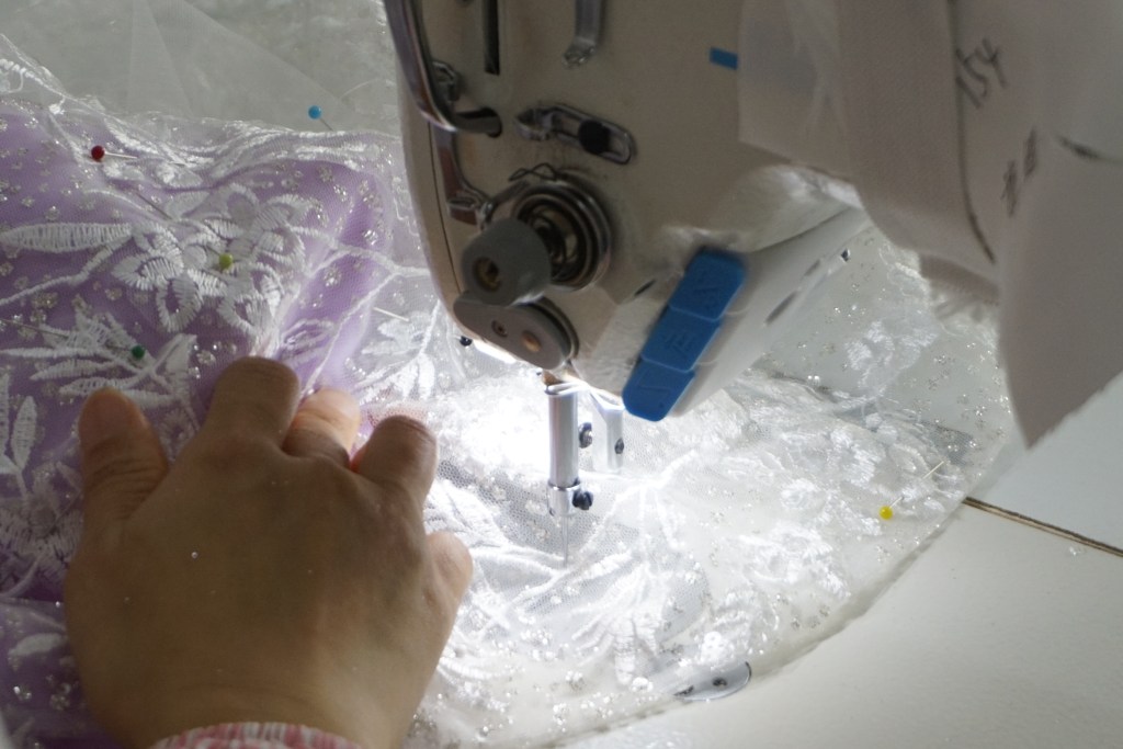 白サテンのスカートから覗くきらっと輝くラメチュールの絶妙バランス。