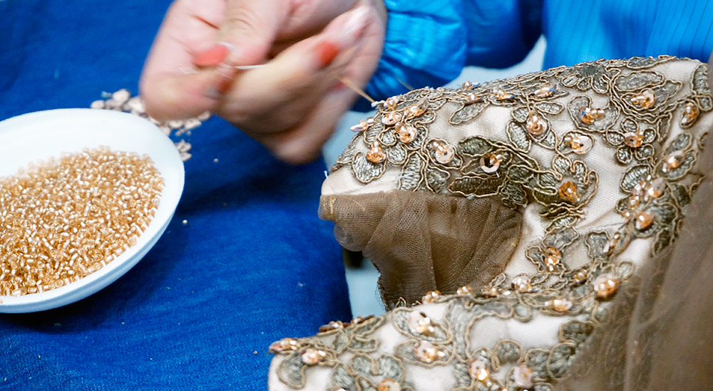 スパンコールの場合、スパンコールと小さなビジューをそれぞれとりつけます。