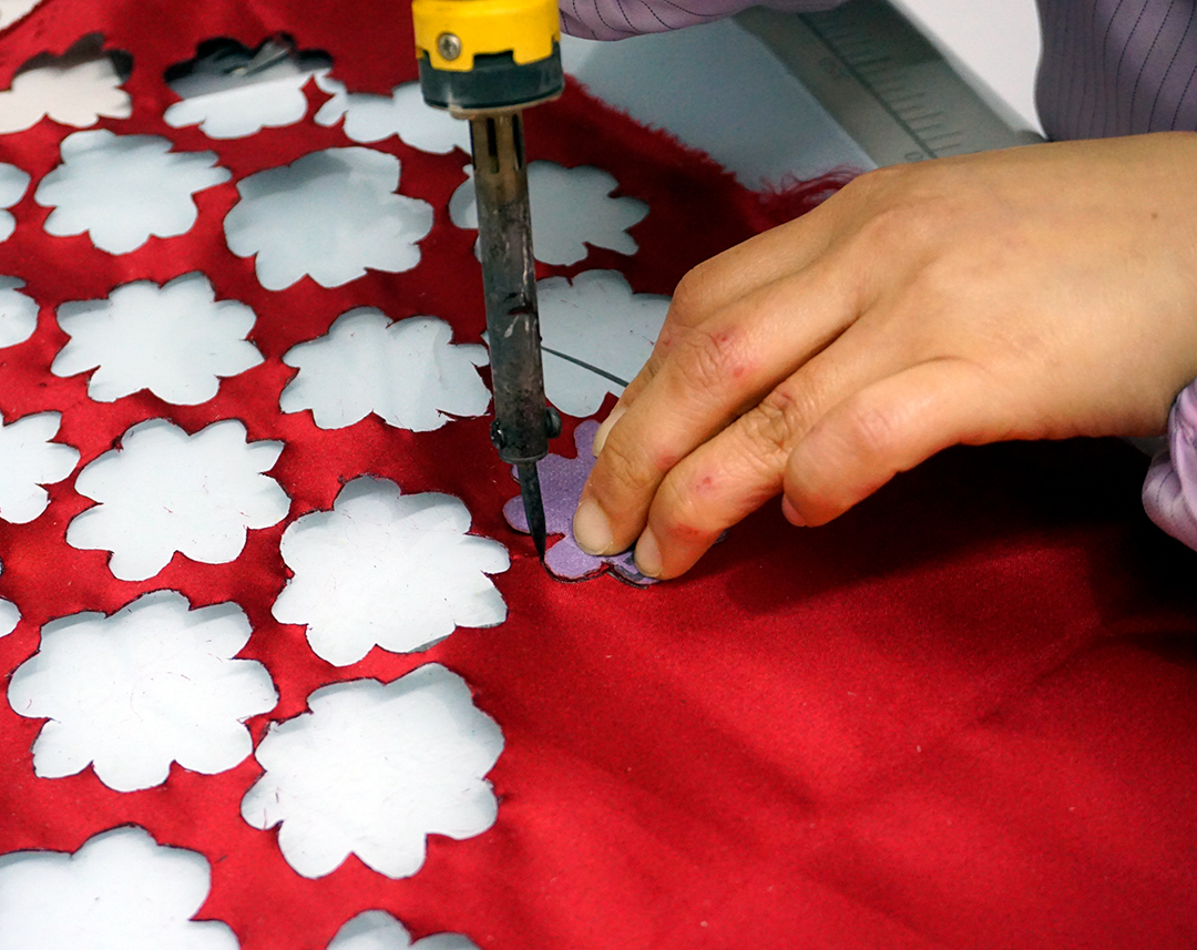 サテンの生地を肩を使ってコテで切り取っていきます。