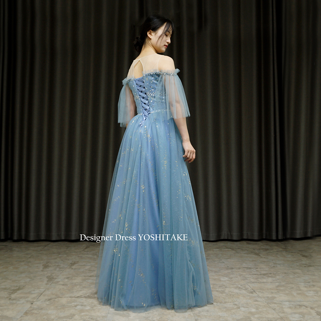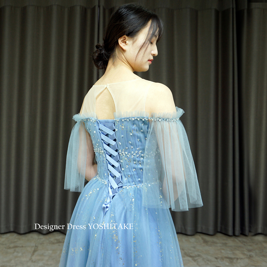 二の腕が気になる花嫁様のリクエストにお答えしまして、チュールのオフショルダーの袖付きになります。バストのラインはVに切り目をいれています。デザイン上ずり落ちないよう、肩に目立たないカラーのチュールにてご着用ください。