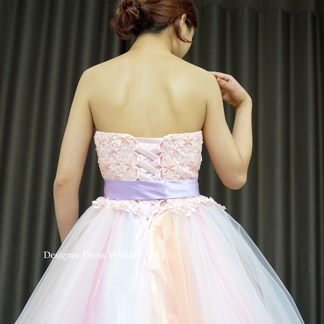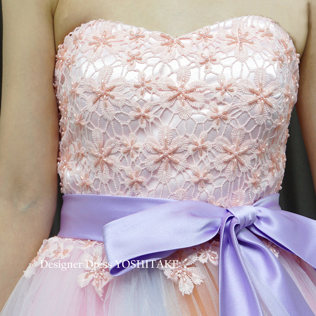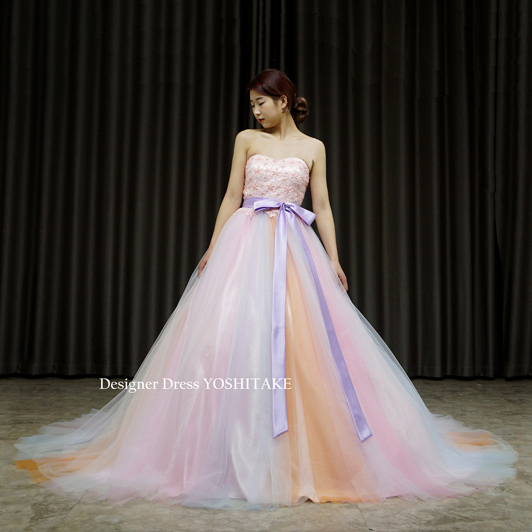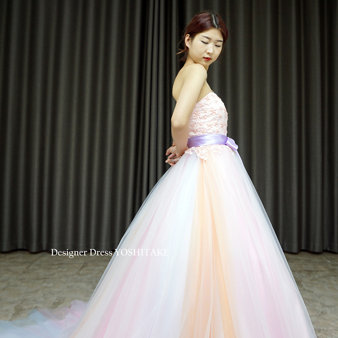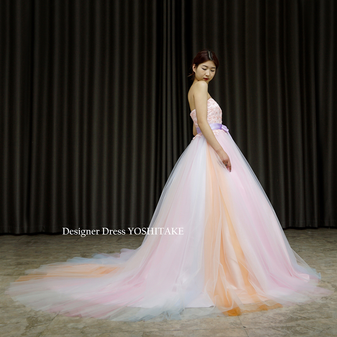 他の花嫁様とはかぶらない個性的なレインボードレス。上半身は薄いピンクの花レースに、花形にビジューをとりつけました。カラーは薄めのパステル系のカラーなので、インパクトもありながらもさわやかな印象となっています。