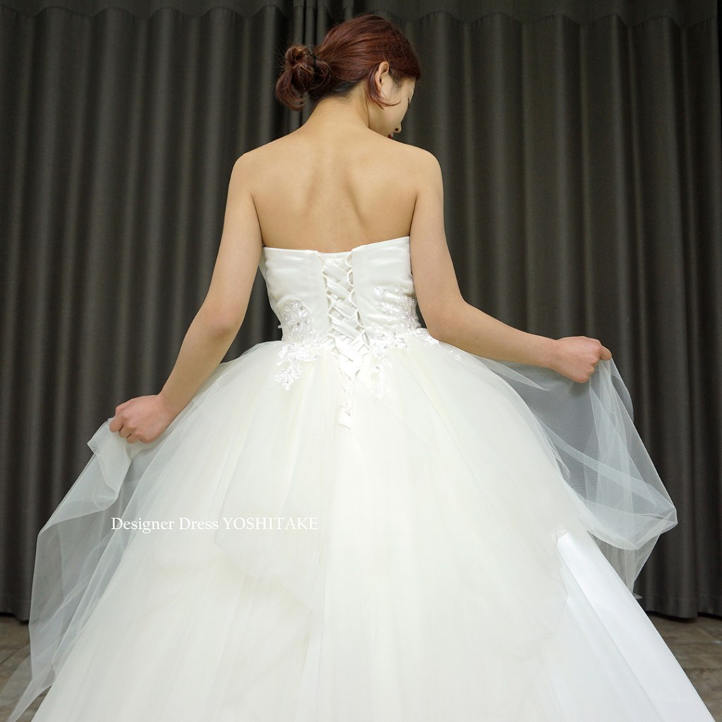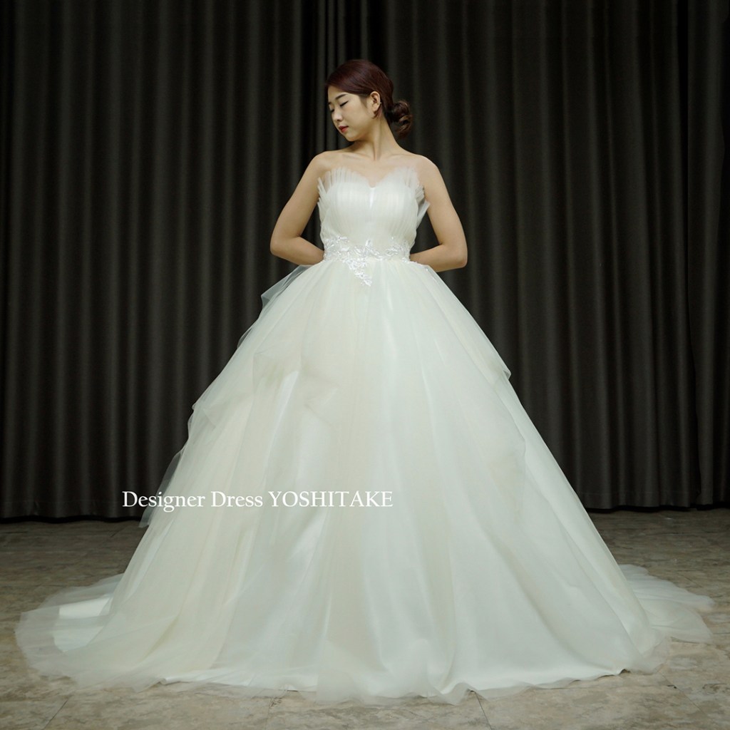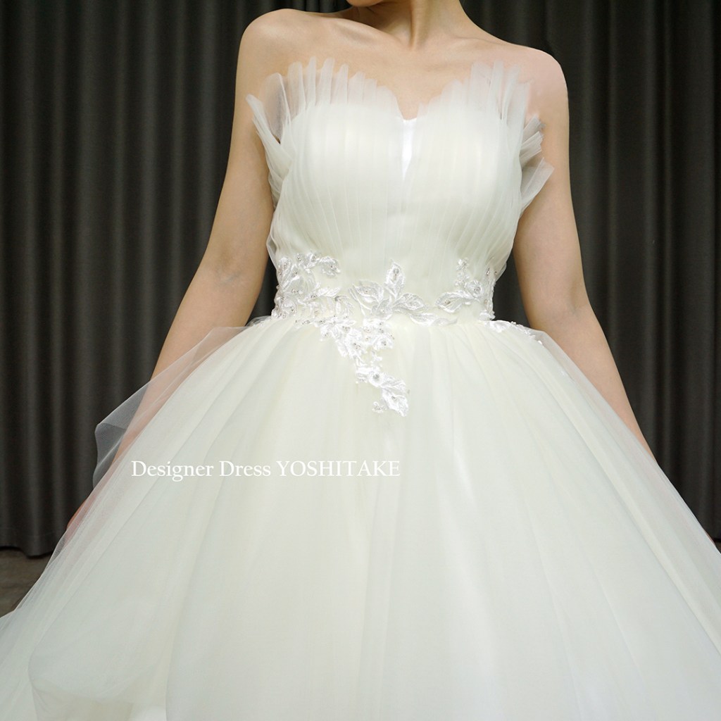 ハート型にカットされた胸元のシェイプ。チュールをランダムに伸ばしギザギザの切り込みを入れました。スカートはふんわりとやわらかな女性らしさを演出した挙式用ドレスです。パニエ付き。前撮りなどにもいかがですか。