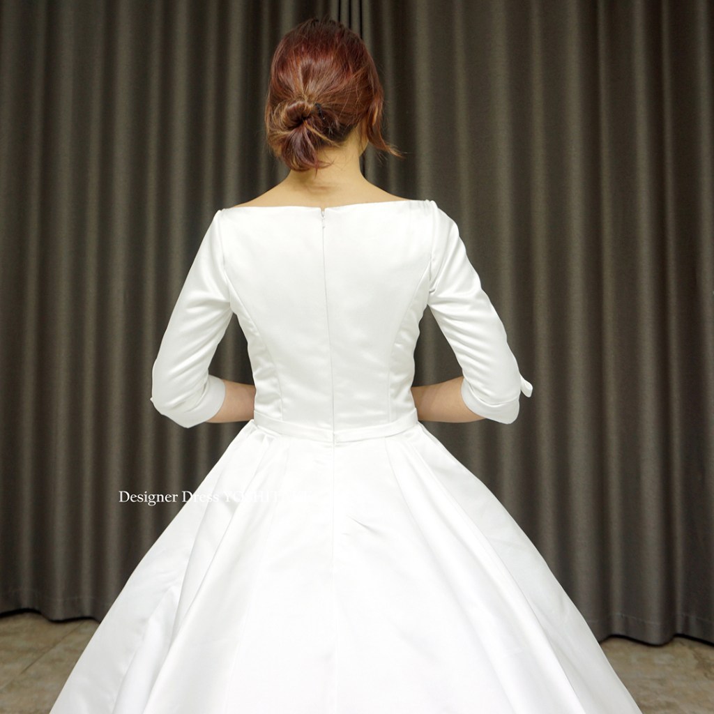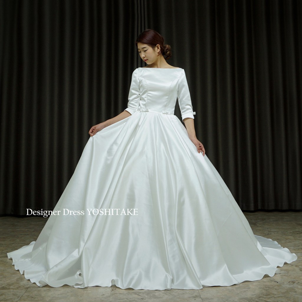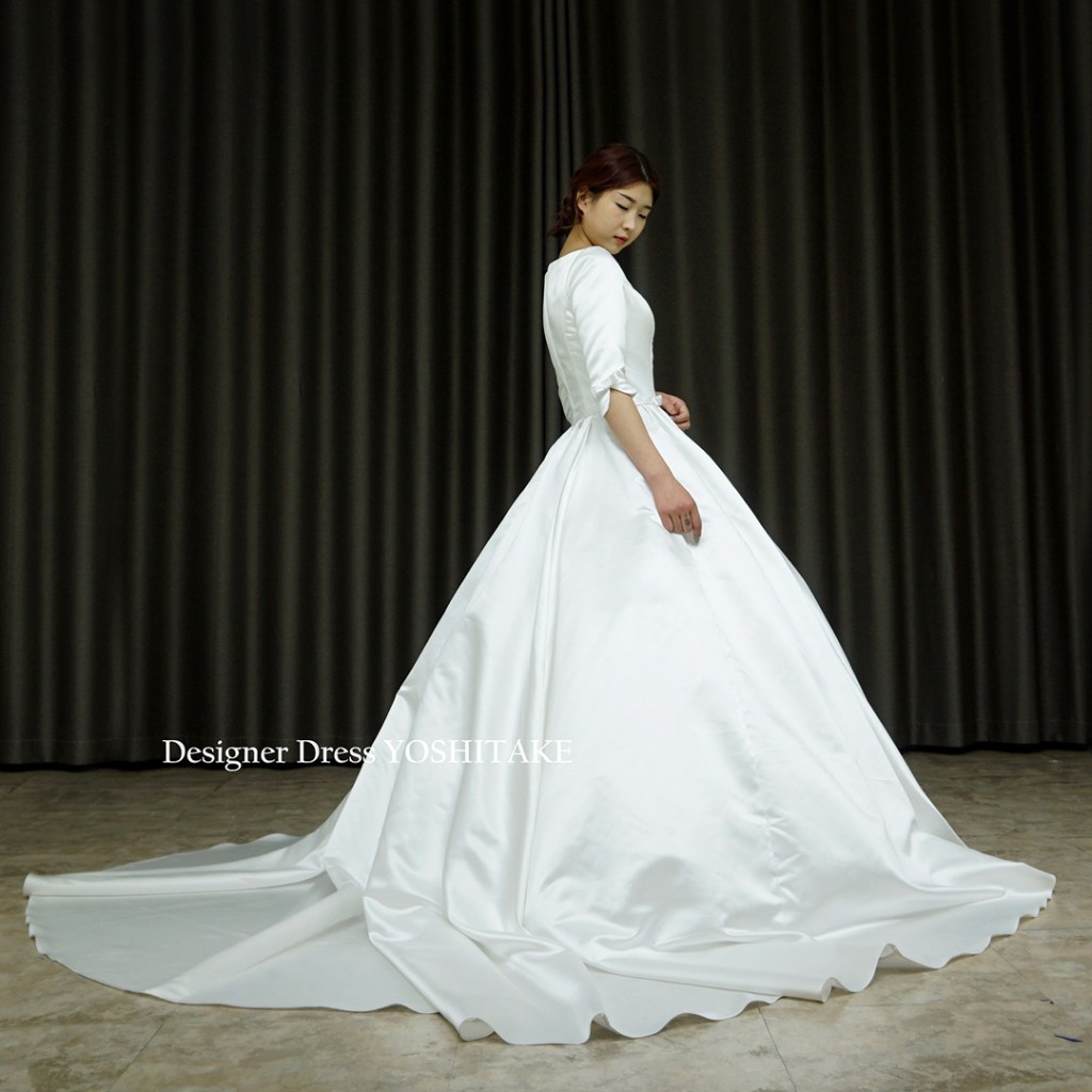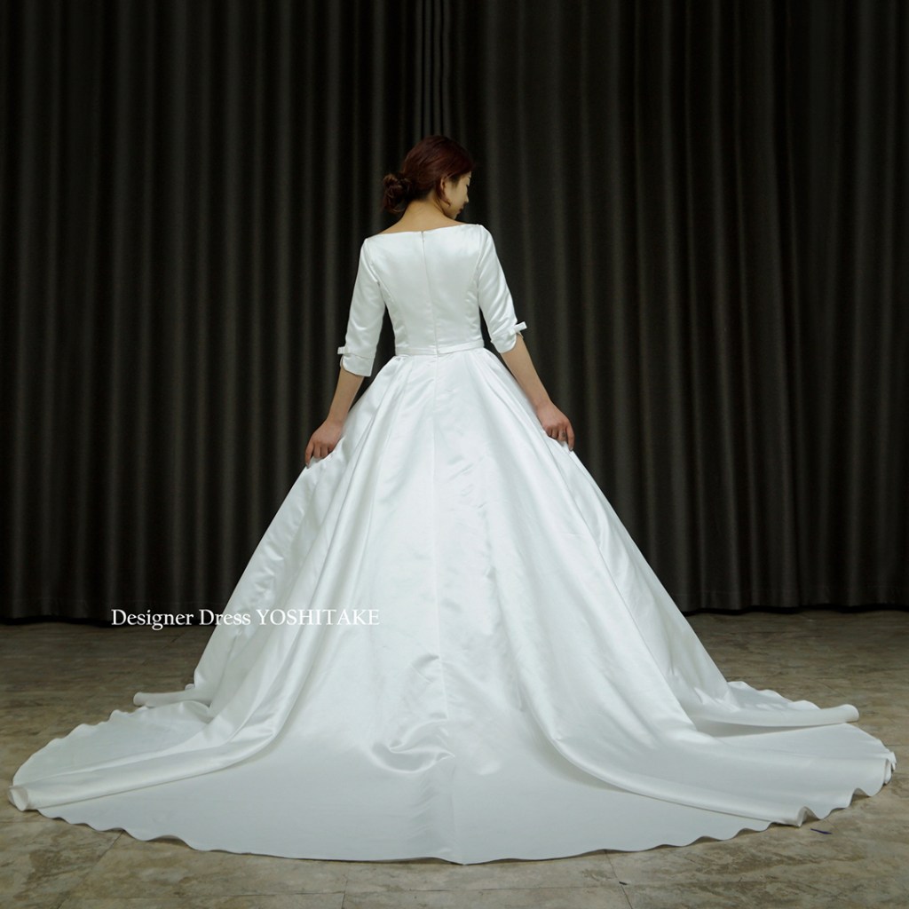 上半身もスカートもすべてサテンにて制作しました。長袖仕様。二の腕が気になるという花嫁様ご安心くださいませ。スカートは大きなボリュームのパニエと一緒にご着用いただきます。今回は背中がジッパーになりますので編み上げに比べますと調整幅がないです。挙式、フォト婚にいかがでしょうか。