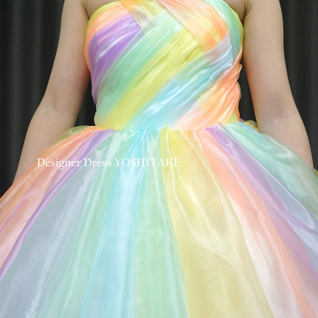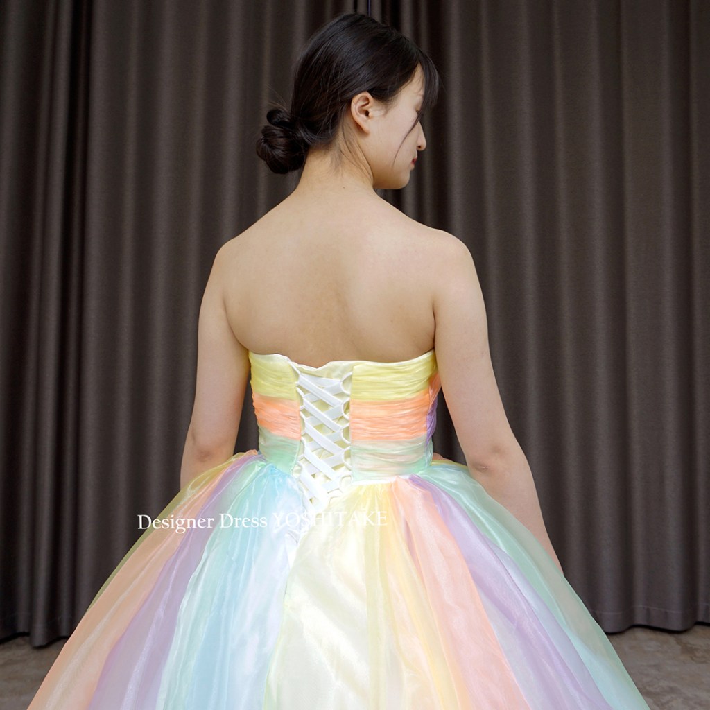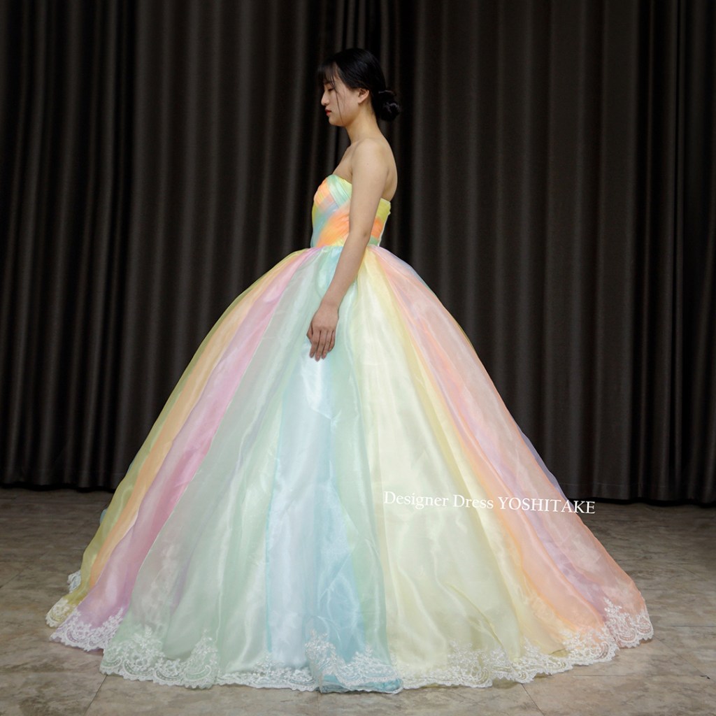 あまり明るいカラーは最近は使わないことが多いのですが、今回は思いきりパステル系のカラーで、光沢あるオーガンジー素材で制作してみました。スカートの裾にはレースを配しました。完全オリジナルドレスです。