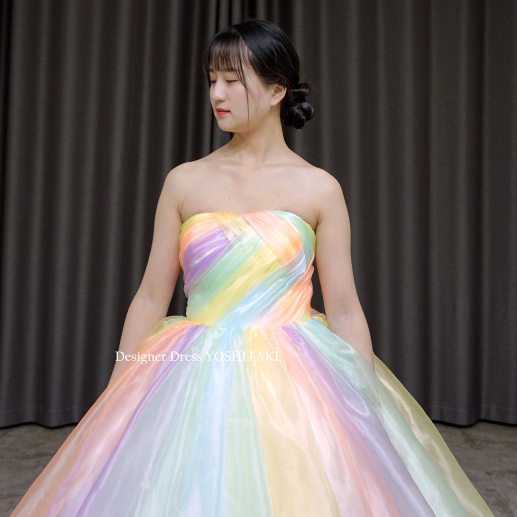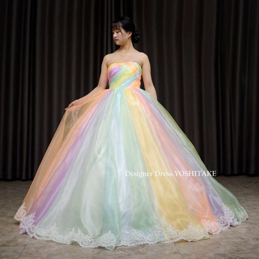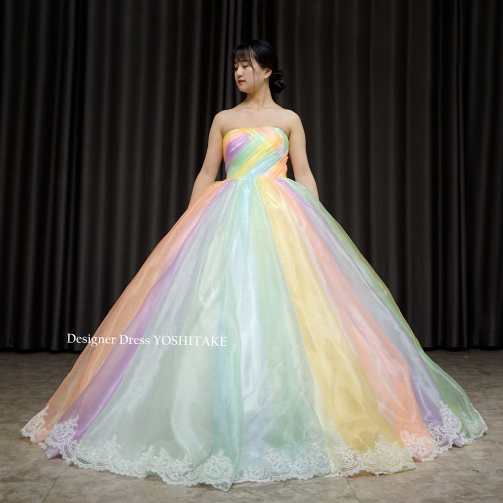 あまり明るいカラーは最近は使わないことが多いのですが、今回は思いきりパステル系のカラーで、光沢あるオーガンジー素材で制作してみました。スカートの裾にはレースを配しました。完全オリジナルドレスです。