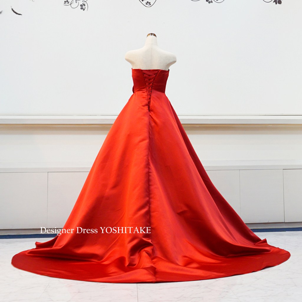 Aラインサテンのカラードレスを制作しました。上半身はアシンメトリー(左右非対称)に上半身およびスカートともに変化をつけて制作しました。ウエストにはハンドメイドのお花をとりつけ、取り外しができます。パニエ付きです。