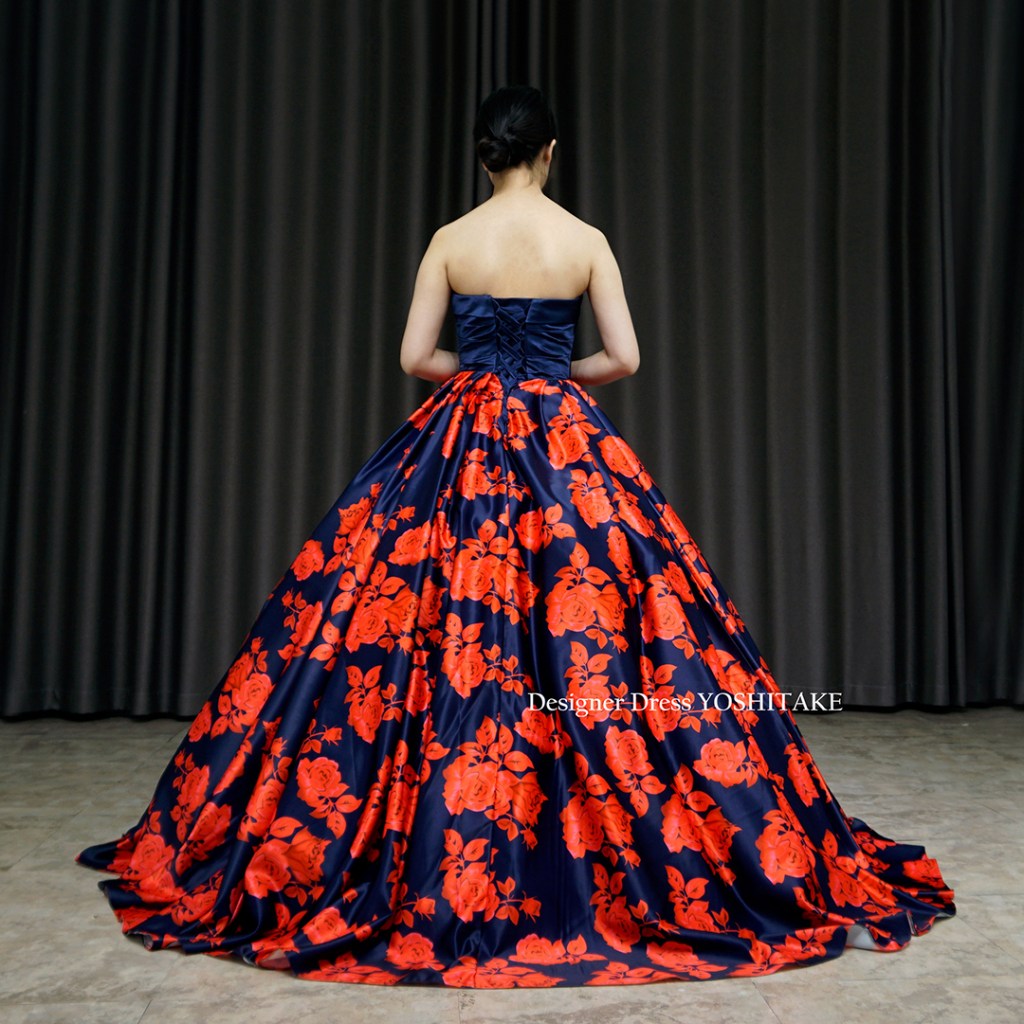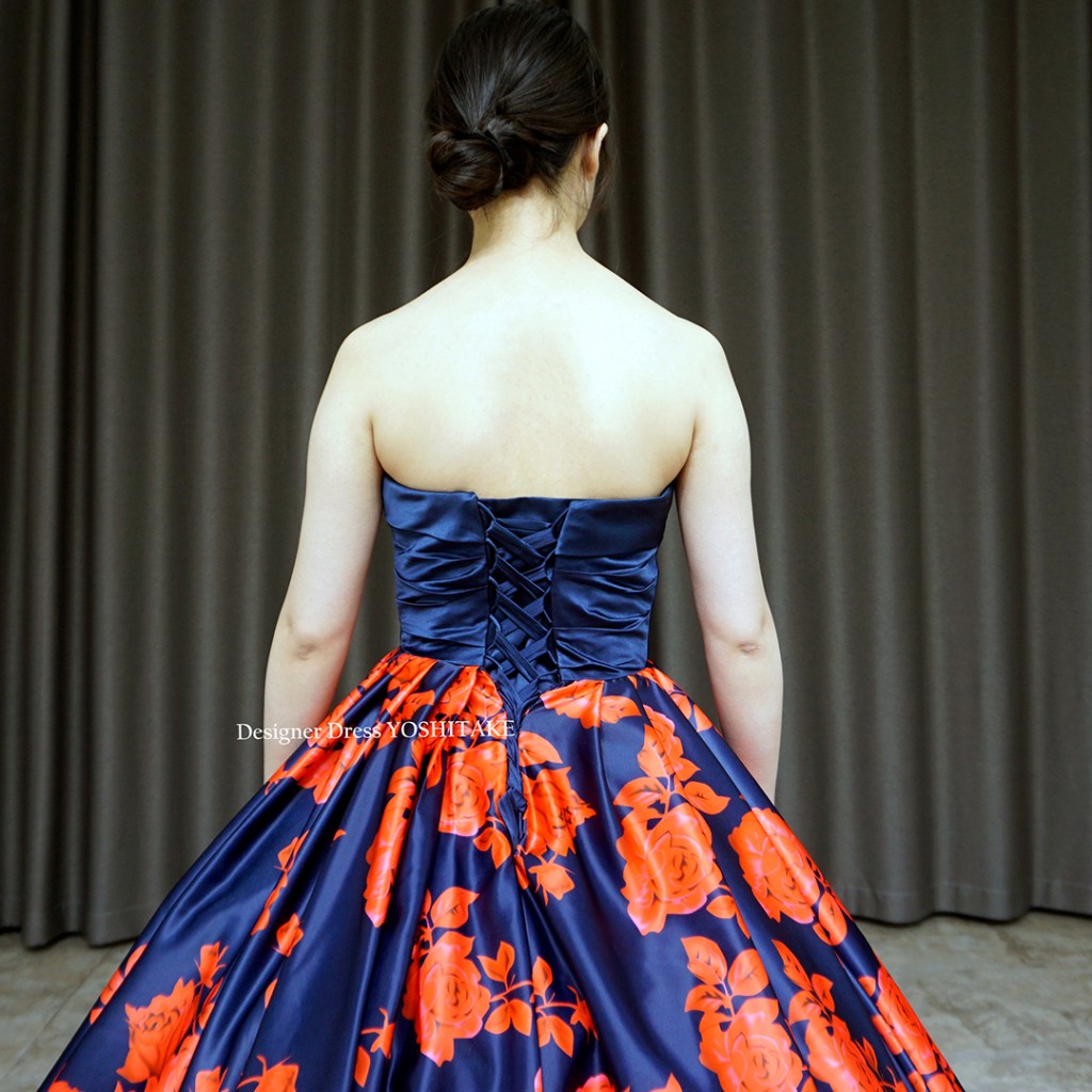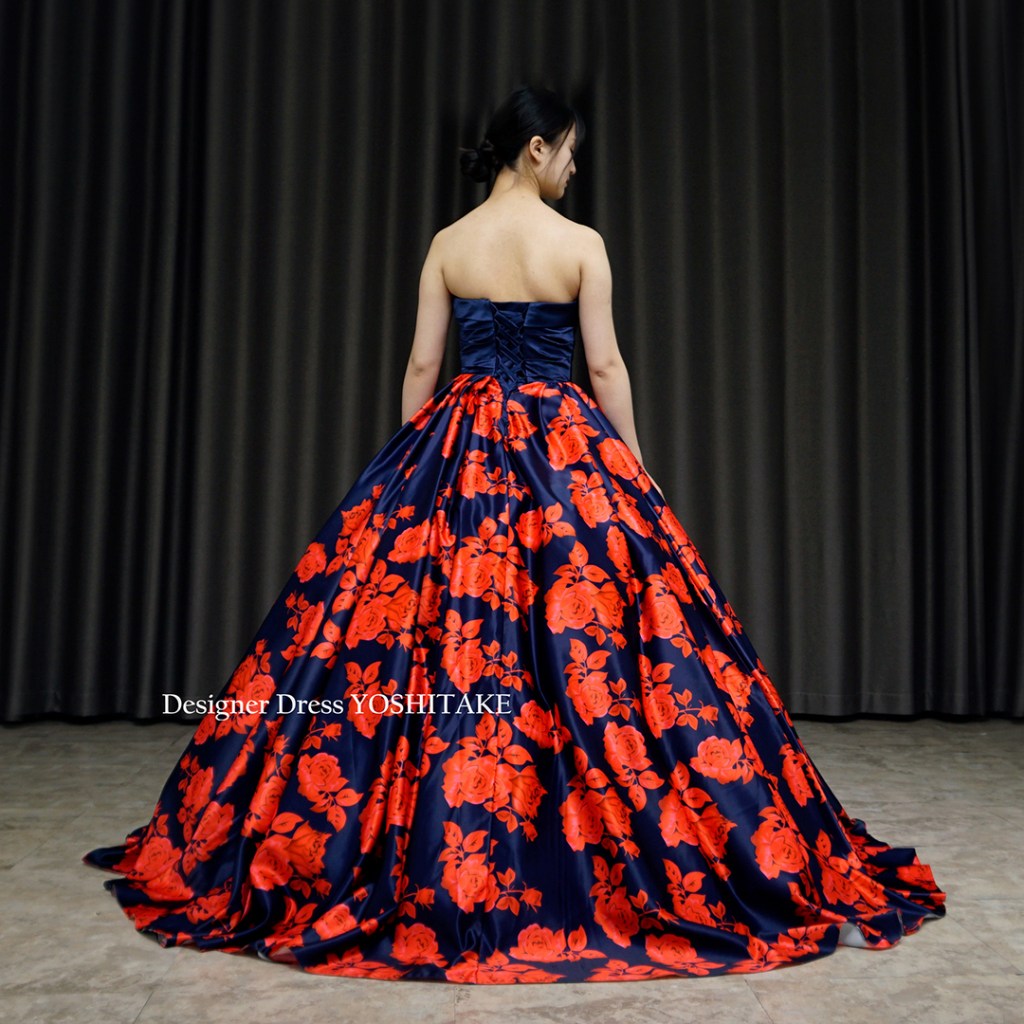 朱赤系とネイビーの2種カラーにて制作。上半身はシックにネイビーだけ使用し、その光沢感が全体の落ち着きを引き上げています。スカートのボリュームをだしたくない場合は、パニエ変更いたしますので、ご相談くださいませ。