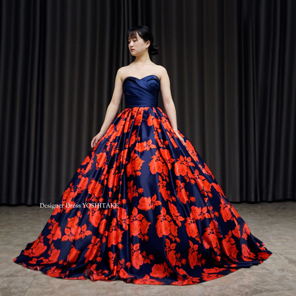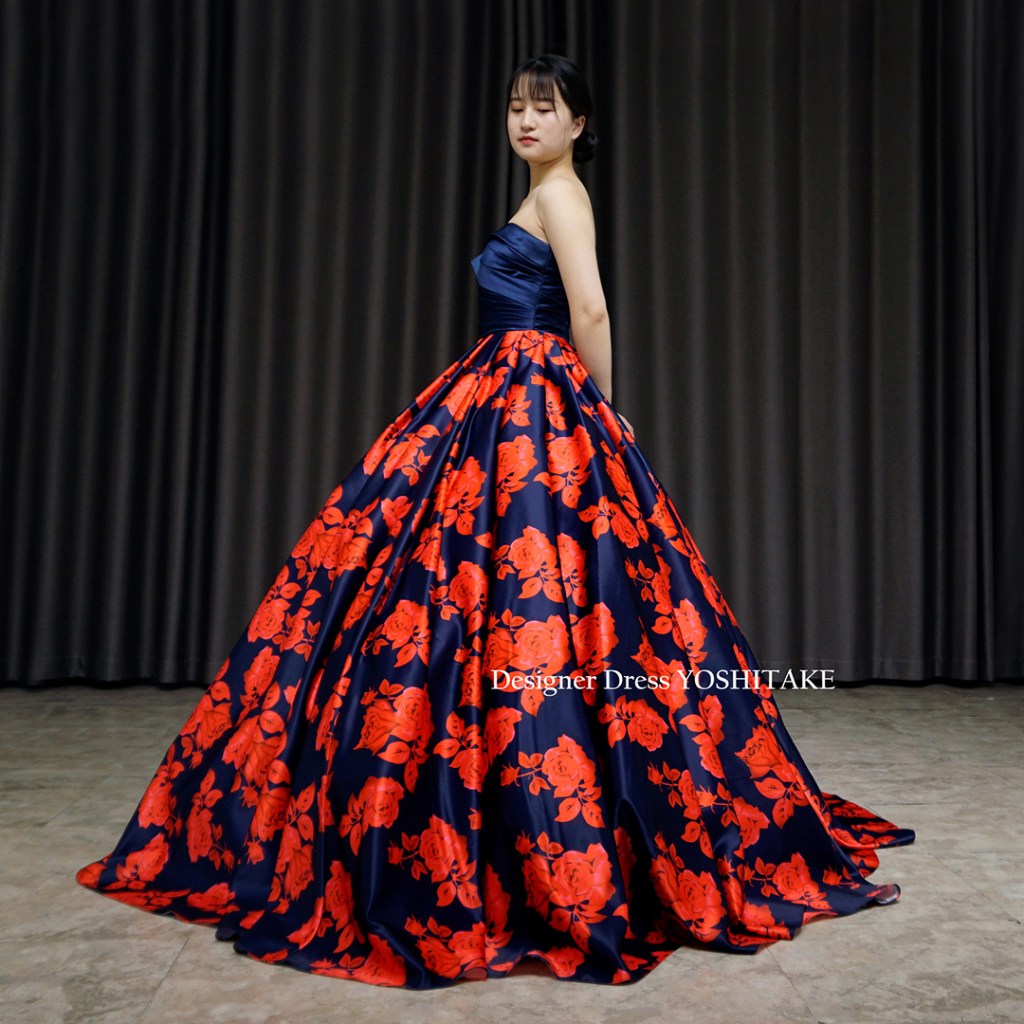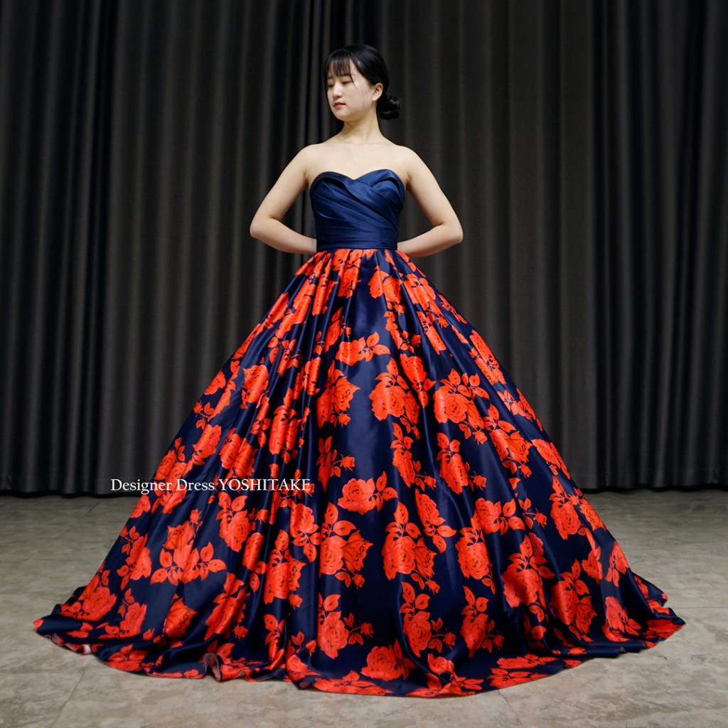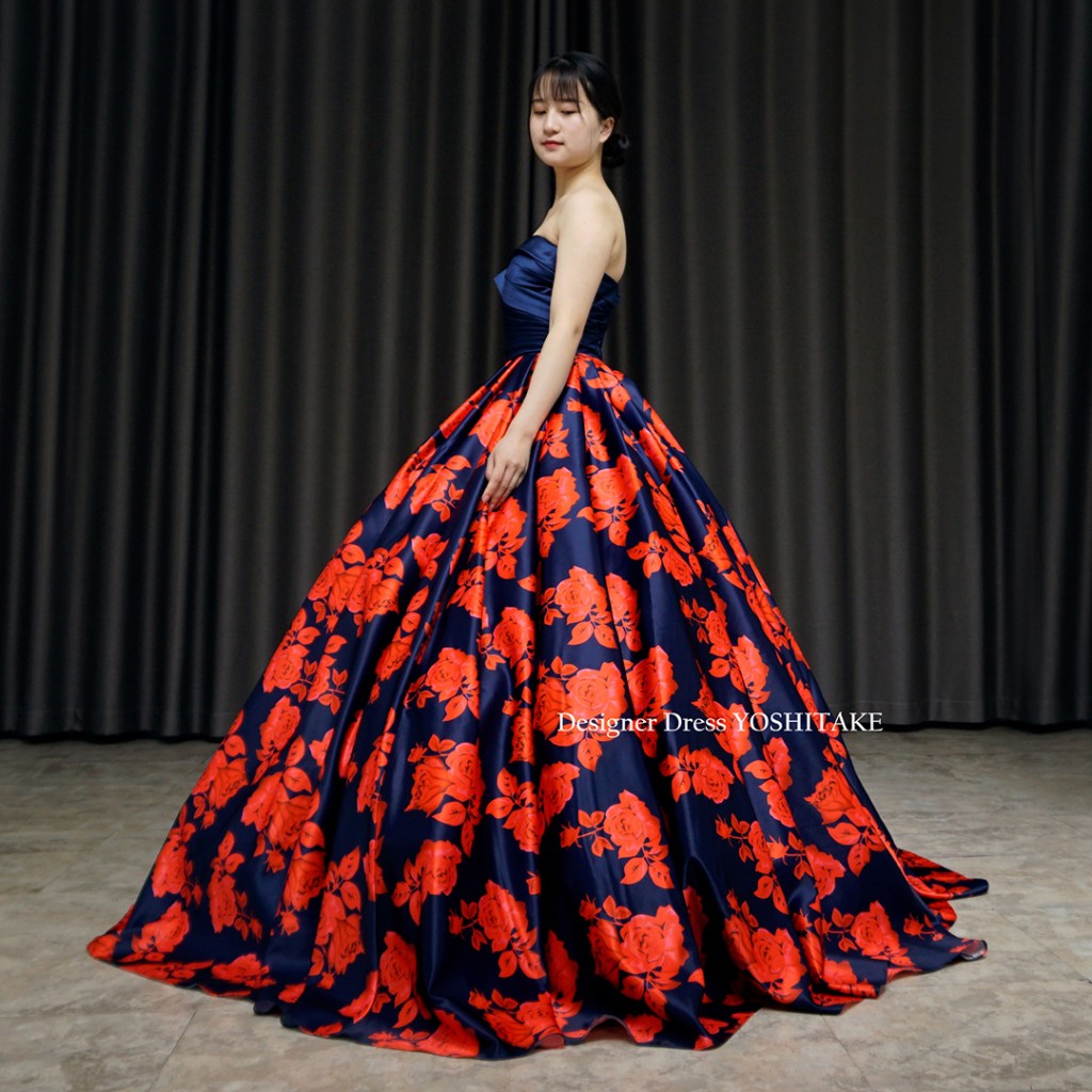 朱赤系とネイビーの2種カラーにて制作。上半身はシックにネイビーだけ使用し、その光沢感が全体の落ち着きを引き上げています。スカートのボリュームをだしたくない場合は、パニエ変更いたしますので、ご相談くださいませ。