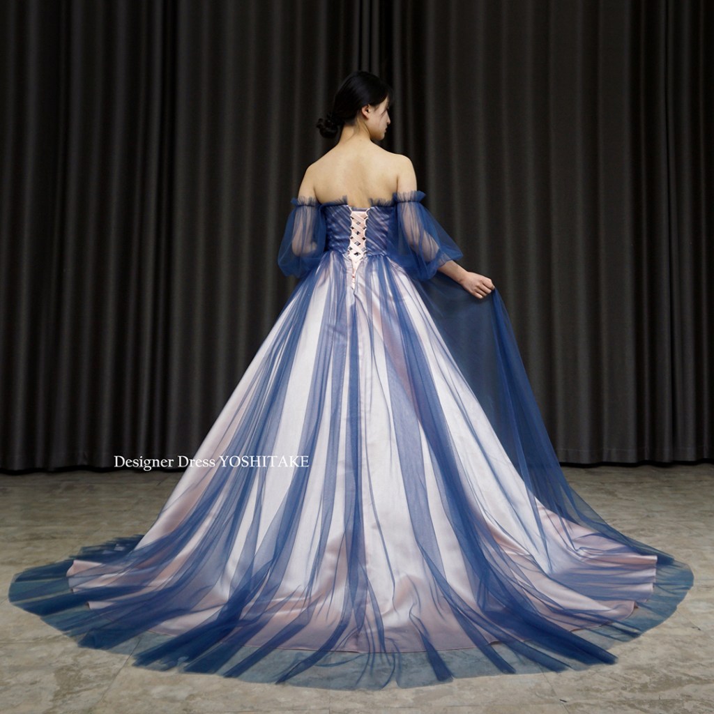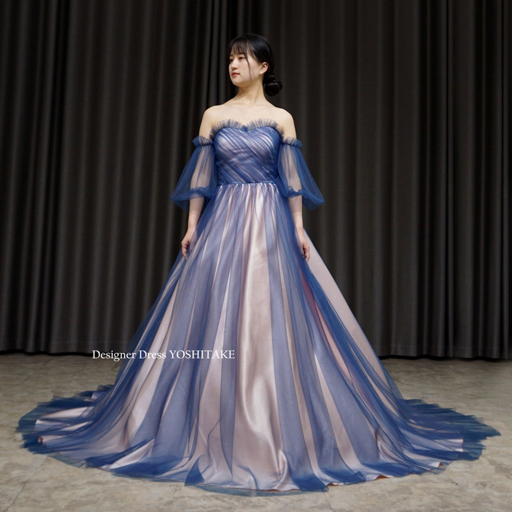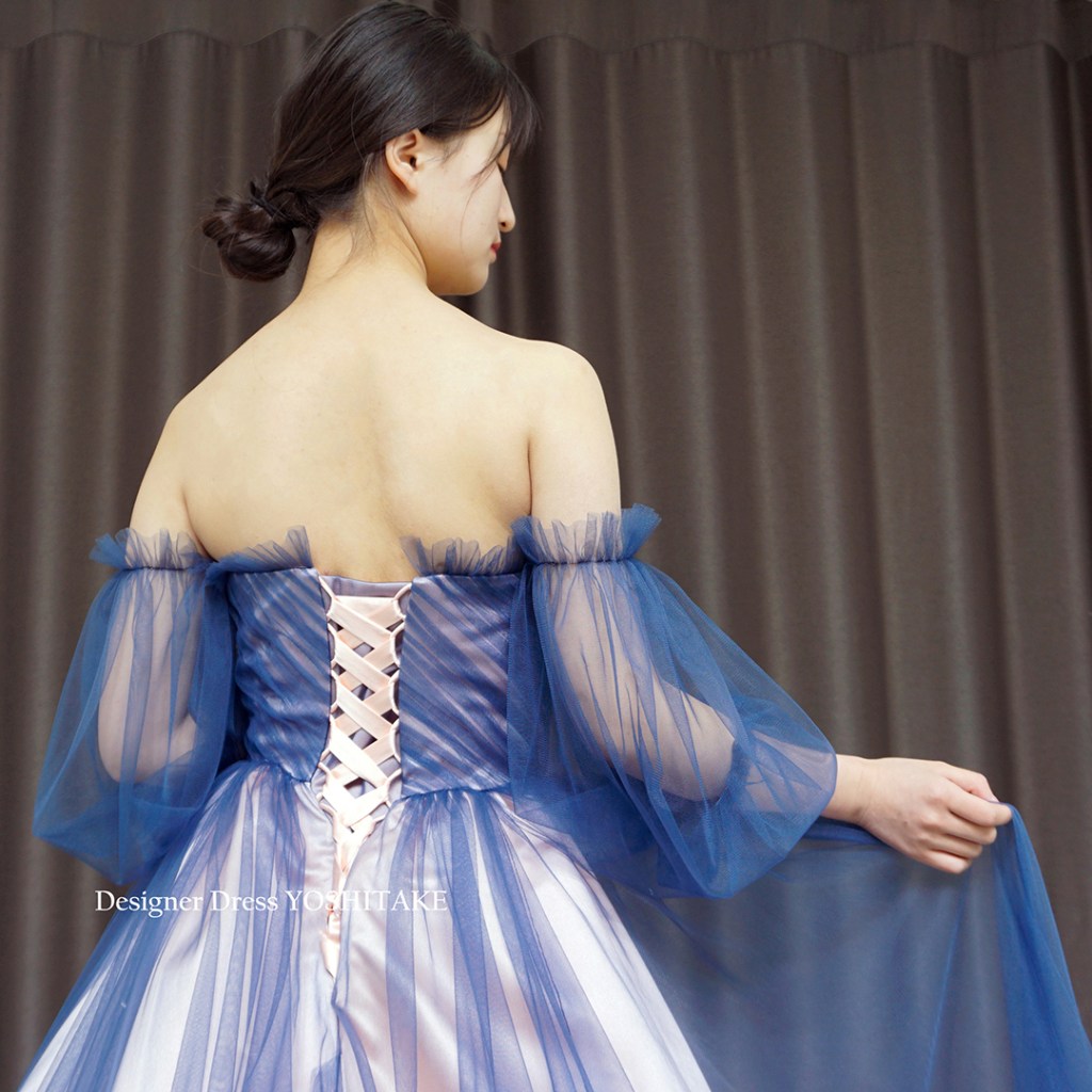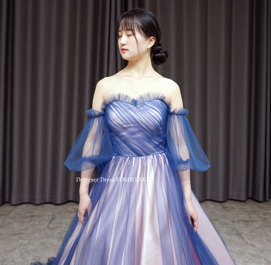 すべてのドレスがそうですが、こちらもオリジナルドレスです。他にないデザインです。下地の薄ピンク系にブルーチュールをかけ、チュールが重なっている箇所のグラデーションが特徴的です.スカートはAラインにてご着用。