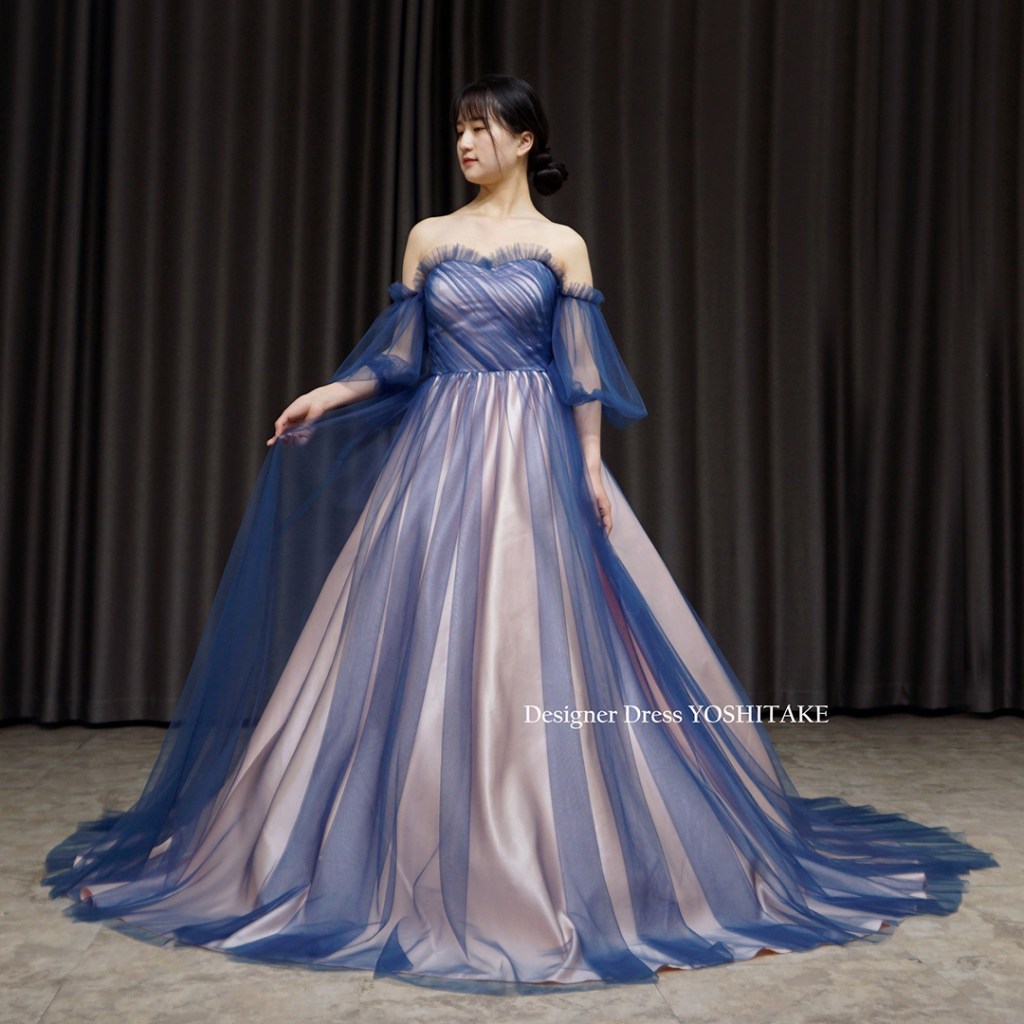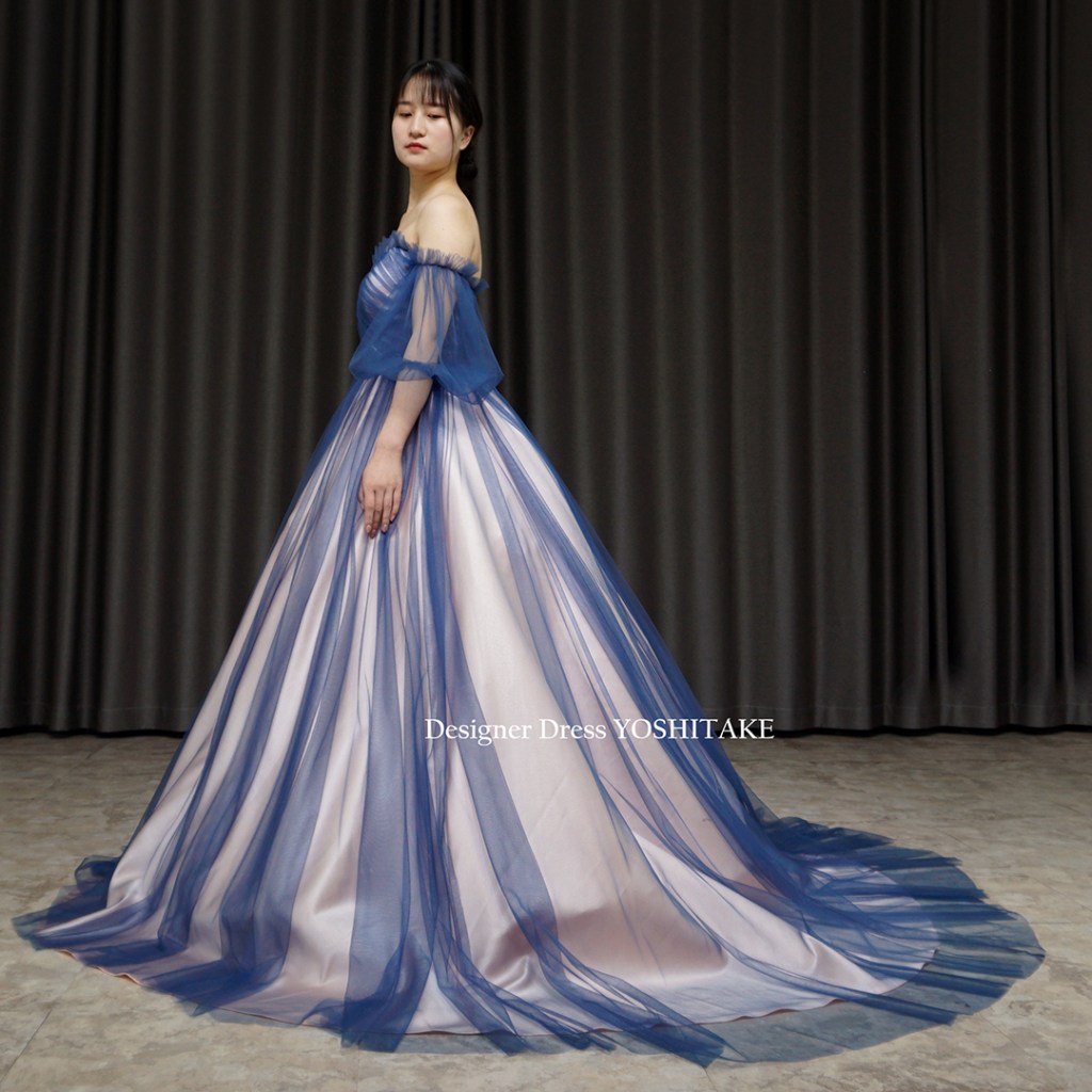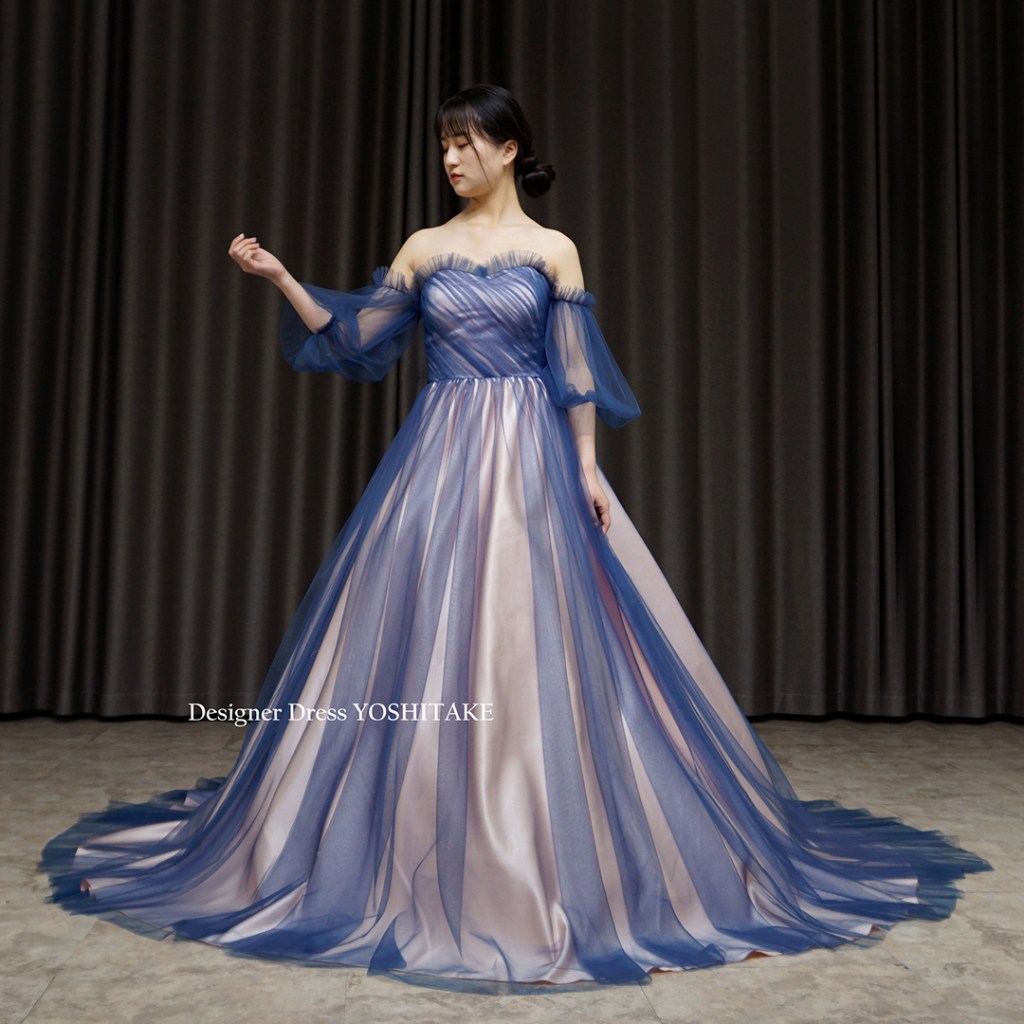 すべてのドレスがそうですが、こちらもオリジナルドレスです。他にないデザインです。下地の薄ピンク系にブルーチュールをかけ、チュールが重なっている箇所のグラデーションが特徴的です.スカートはAラインにてご着用。