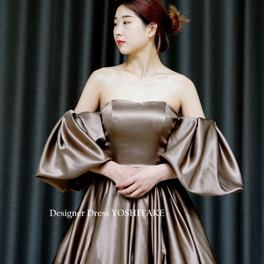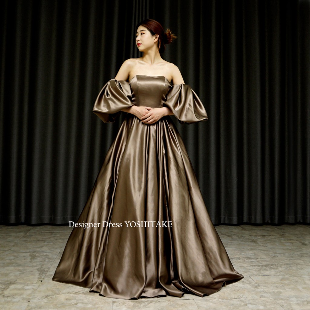 サテンの光沢感と袖のバルーンが特徴のAラインドレスです。