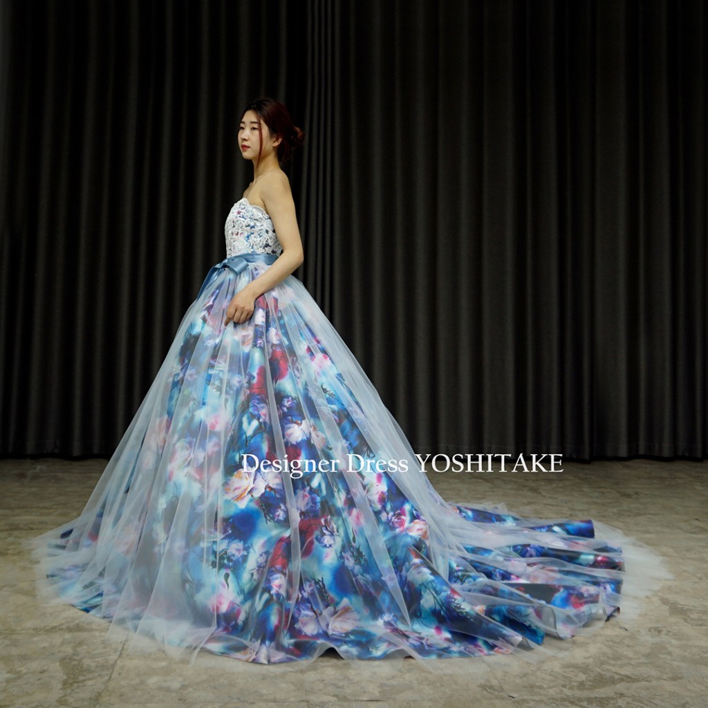 青系花柄&白チュールのドレスです。大きなパニエをいれました。