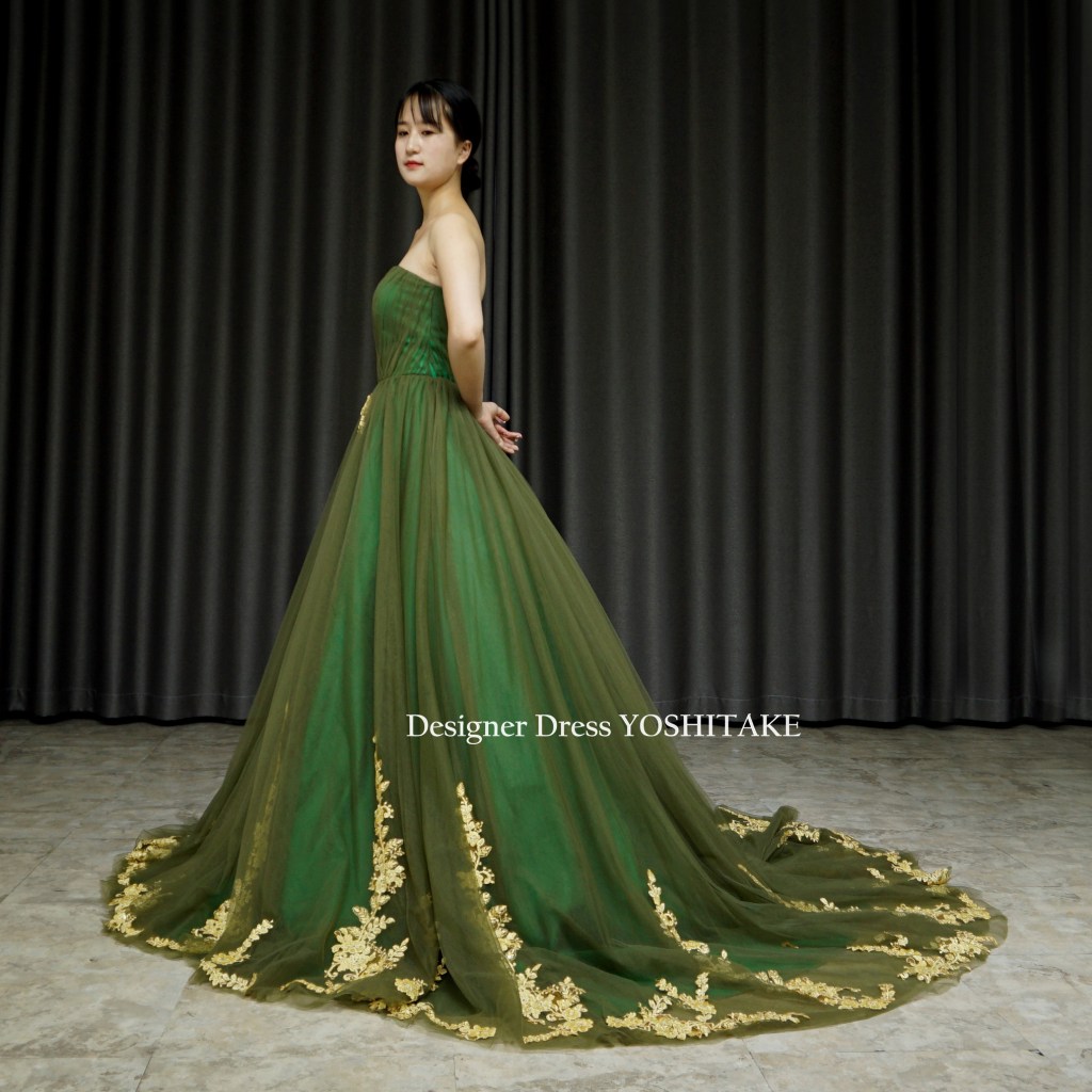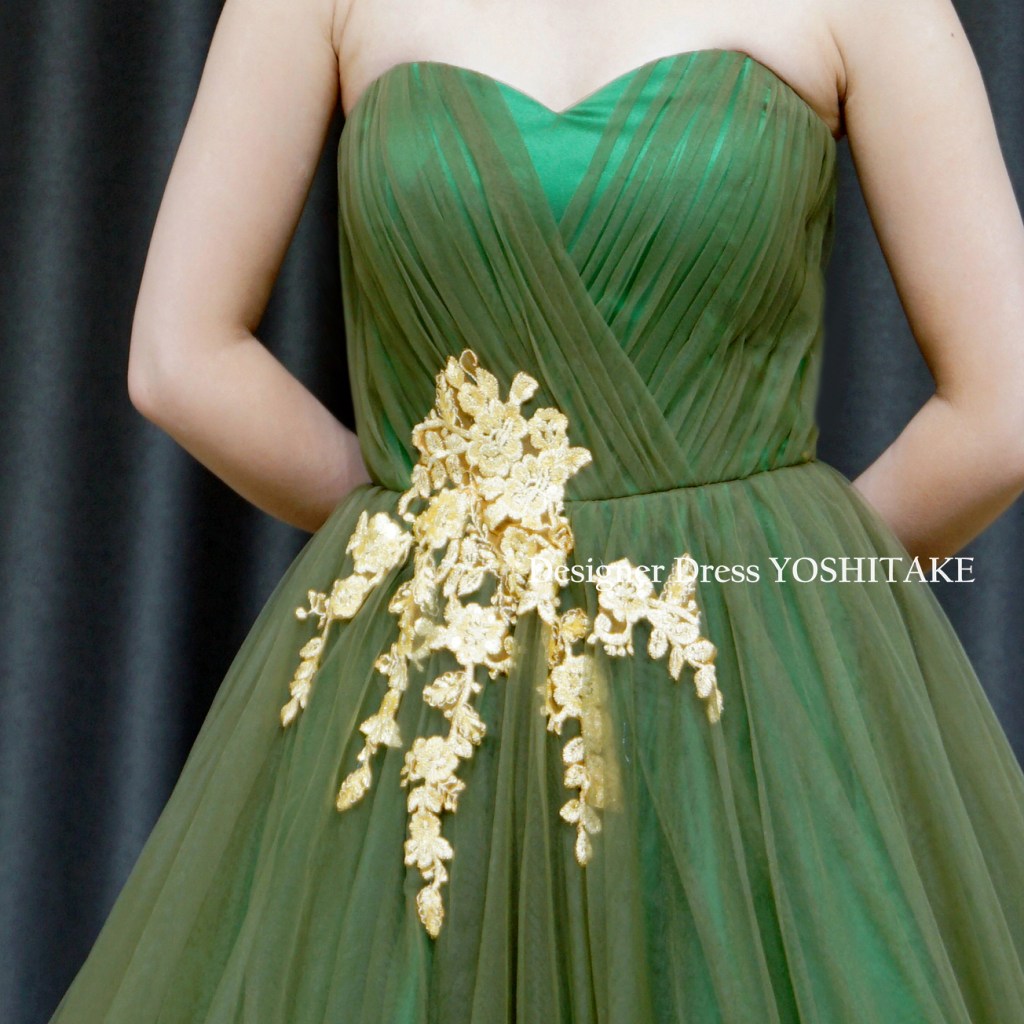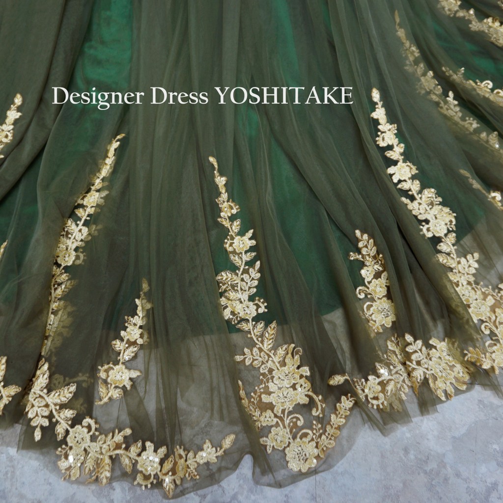 暗めのモスグリーンチュールをスカートにはふんだんに使用。