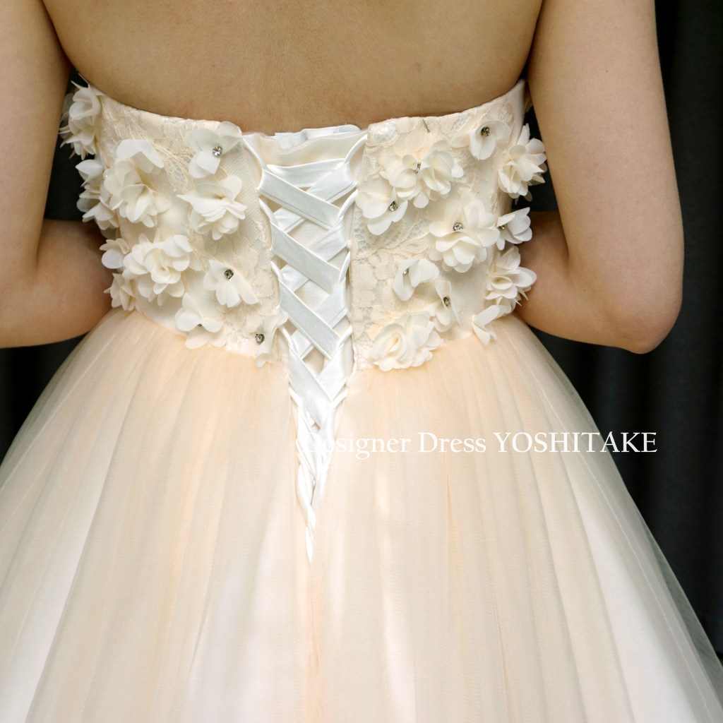 フロントスカートをオープンにして、一枚レースを配し、その上に花をちりばめました。