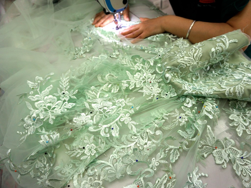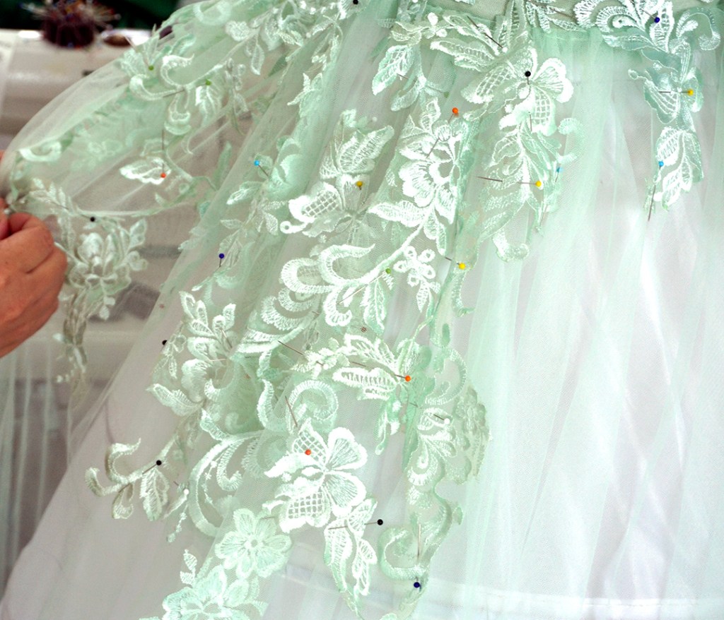 白のレースを、チュールのカラーにあわせて染色したものです。