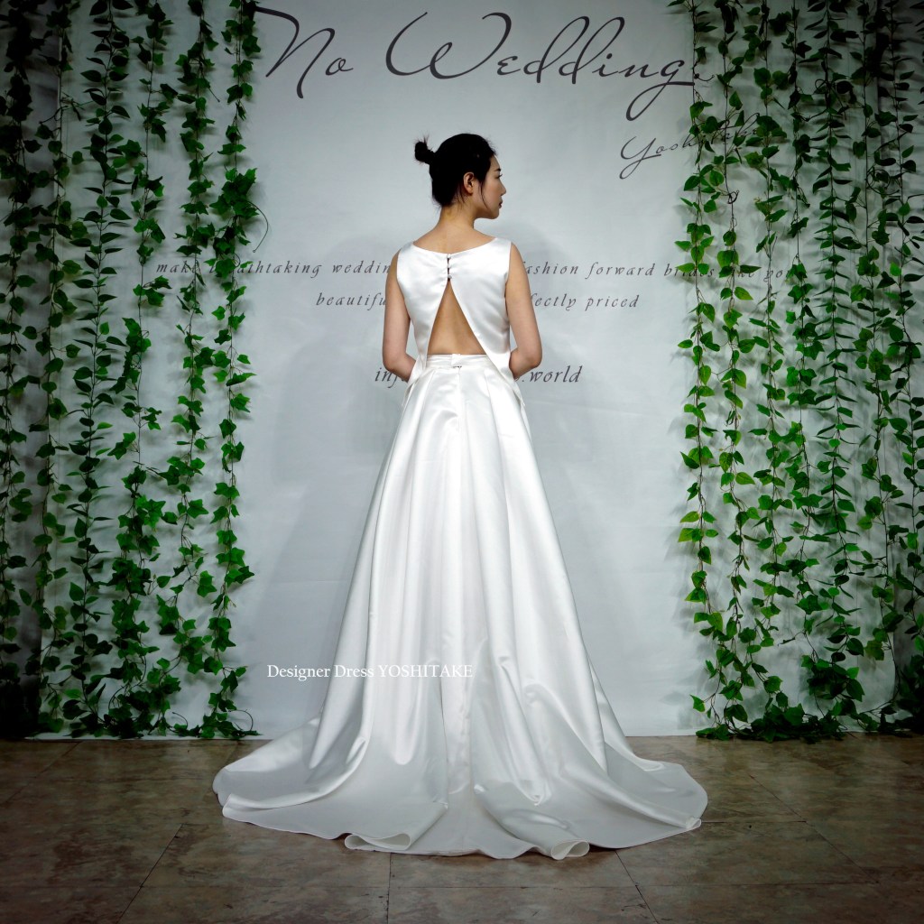 今回はスレンダーラインのスカートに、ちょっと大胆に背中を開いたデザインですがぜんぜんいやらしくなく、むしろキュートな印象が特徴です。