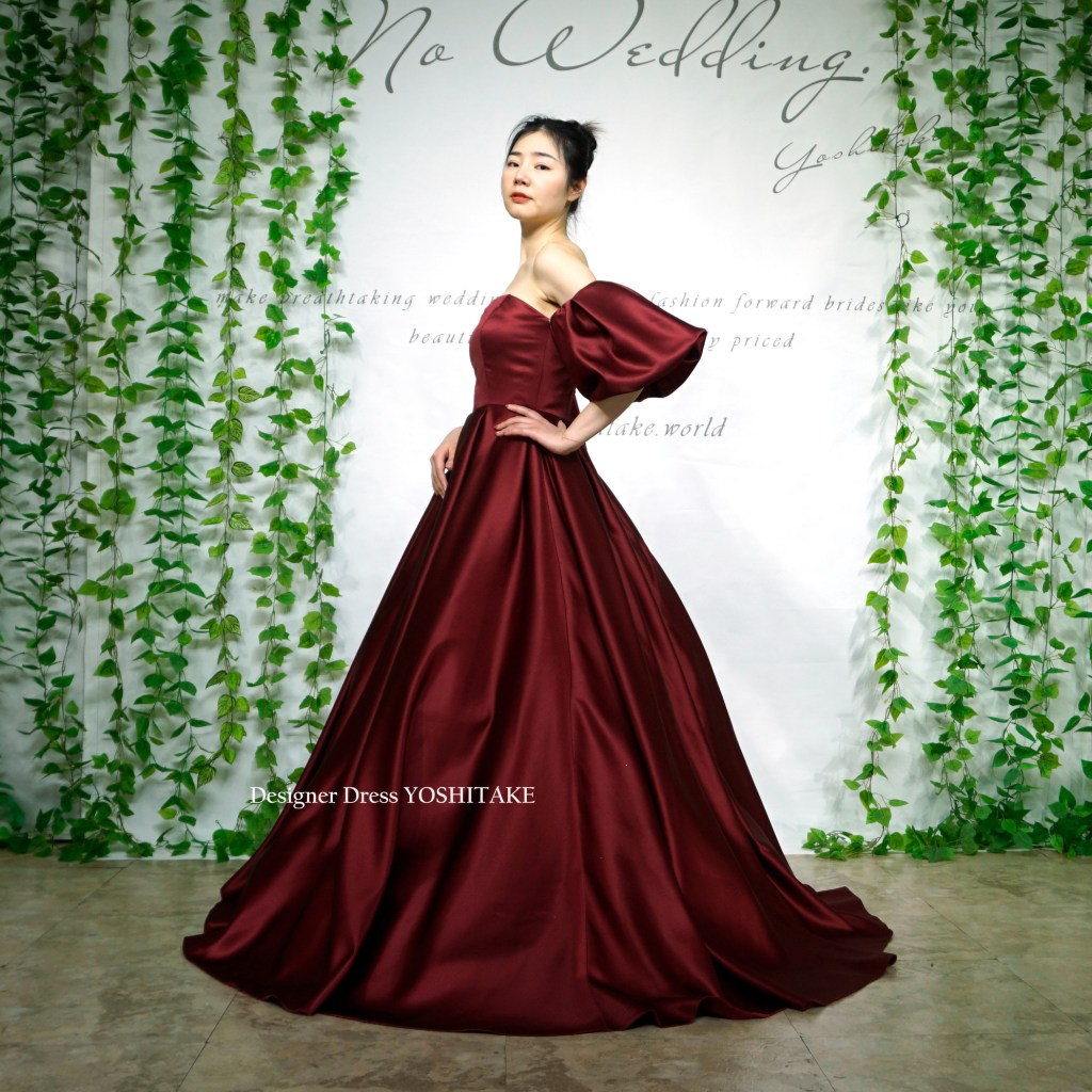 サテンの光沢感とふんわしたバルーン袖が特徴のAラインドレスです。今回はAラインのパニエ付きです。