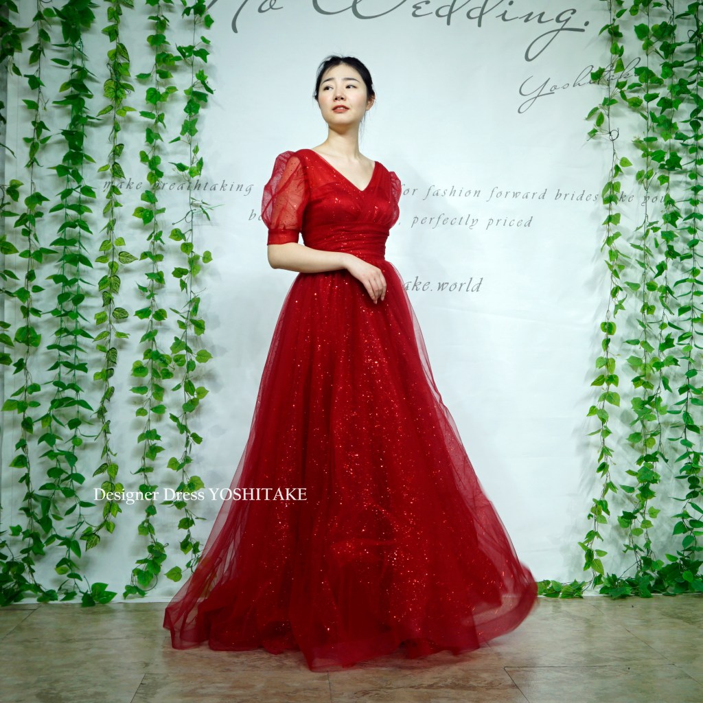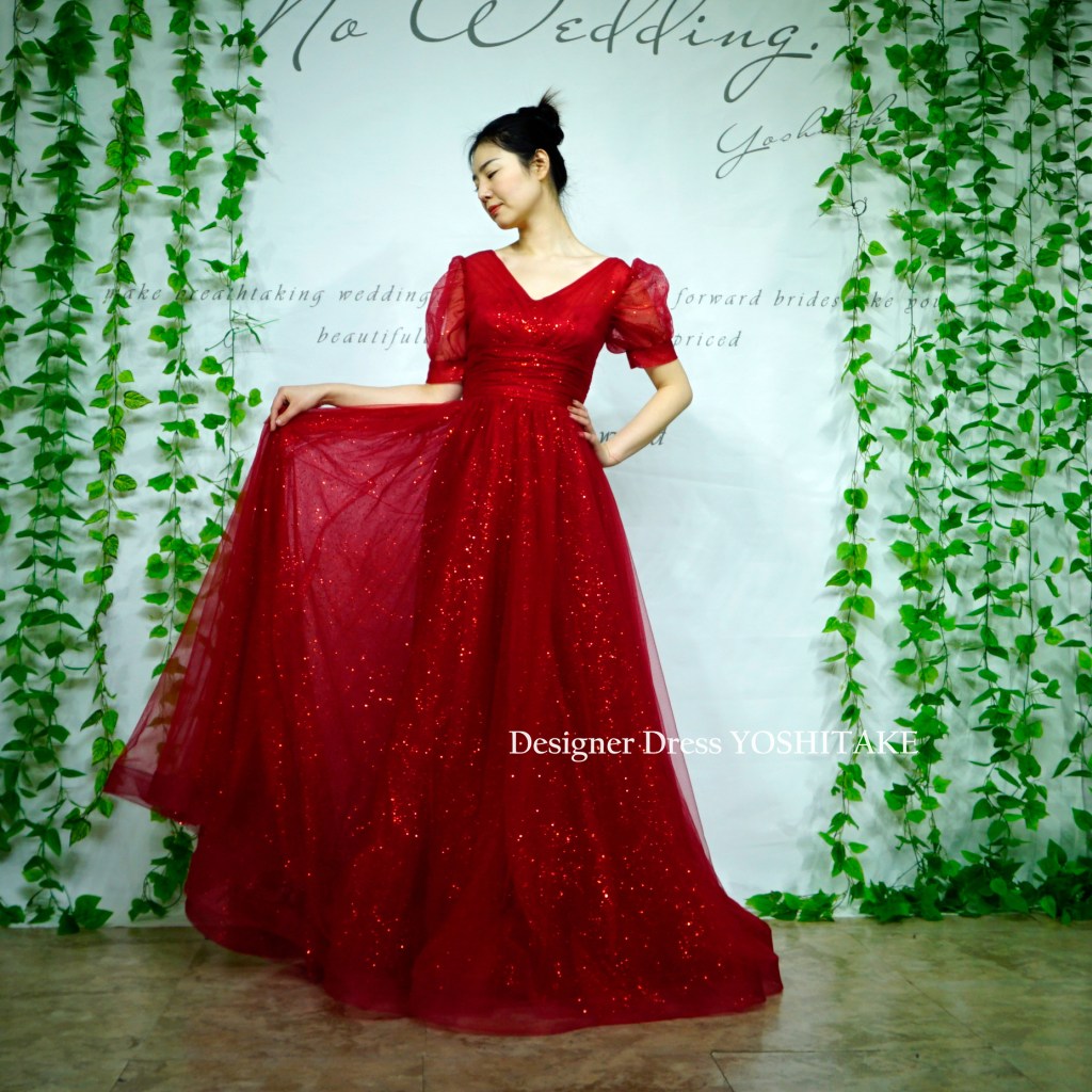 照明が当たると大変キラキラといたします。胸元は浅めのVラインとふんわり半袖が特徴です。
