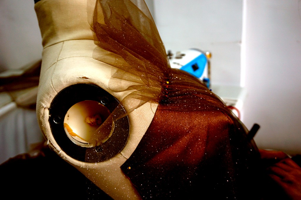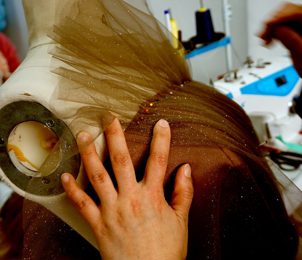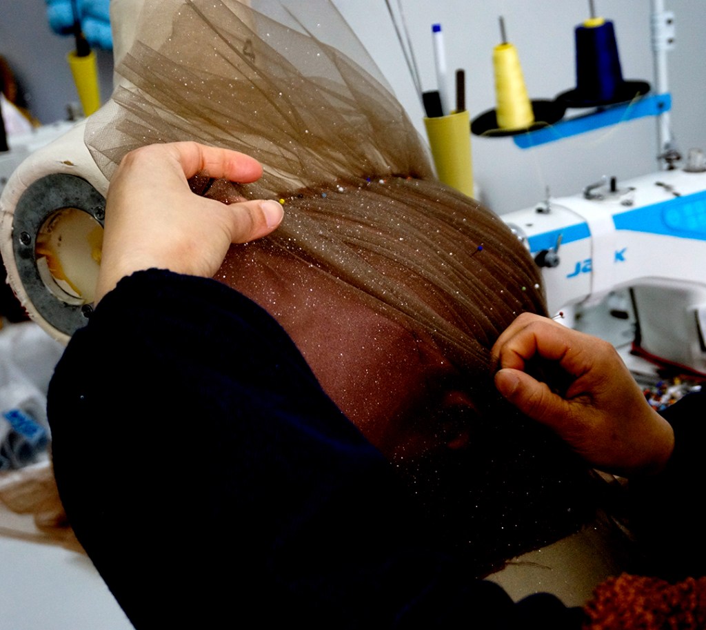 上半身にキラキラしたラメチュールを追加し、プリーツ(皺加工)をつくっていってます。