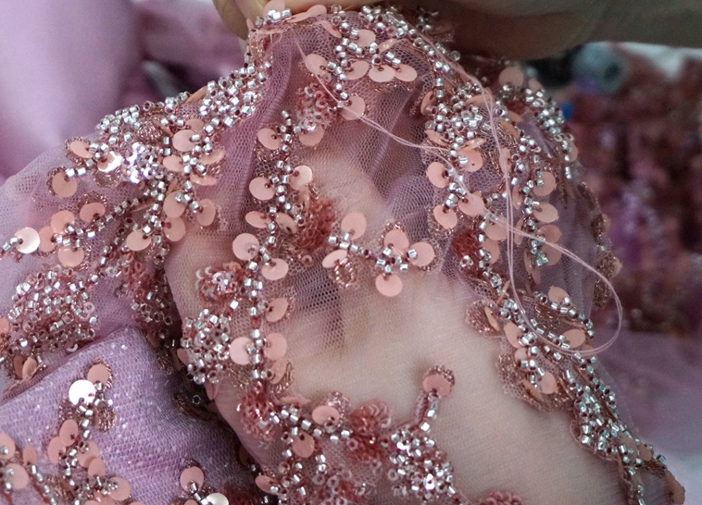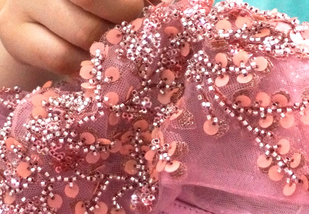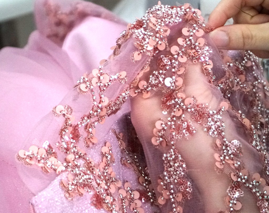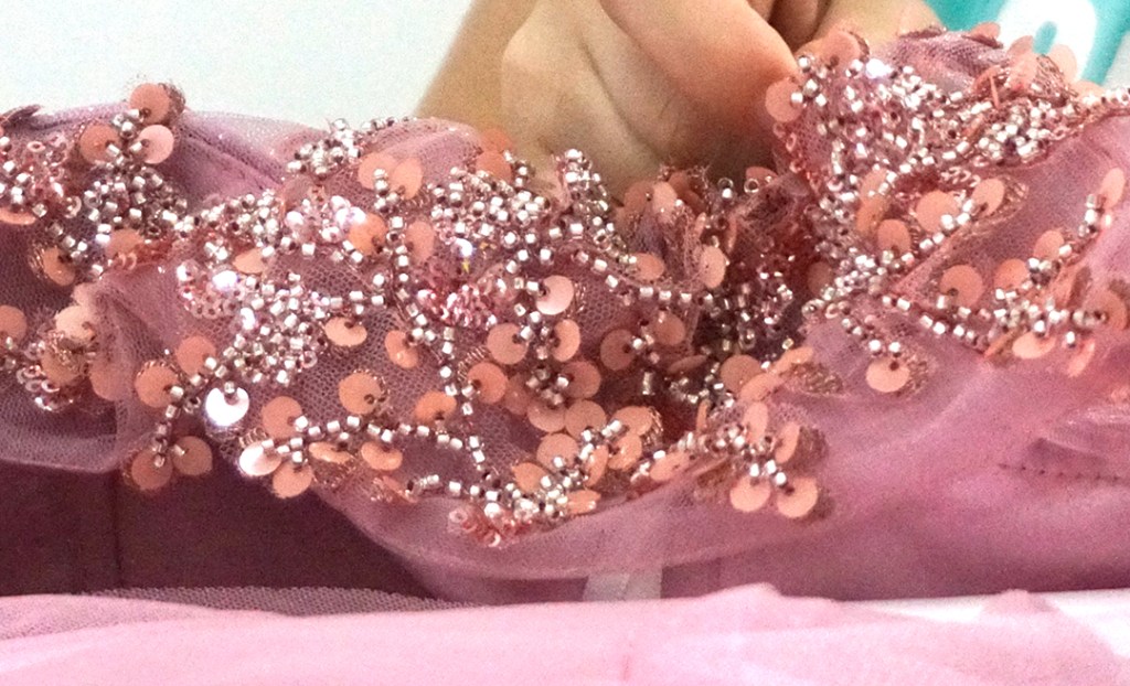 ただいま、ピンクキラキラ素材のドレスを制作中です。