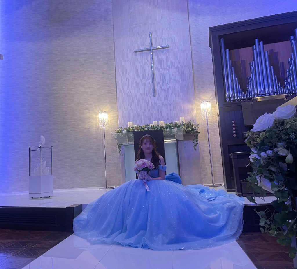 シェリーメイちゃんにもお揃いのドレスを制作し一緒に入場いたしました。