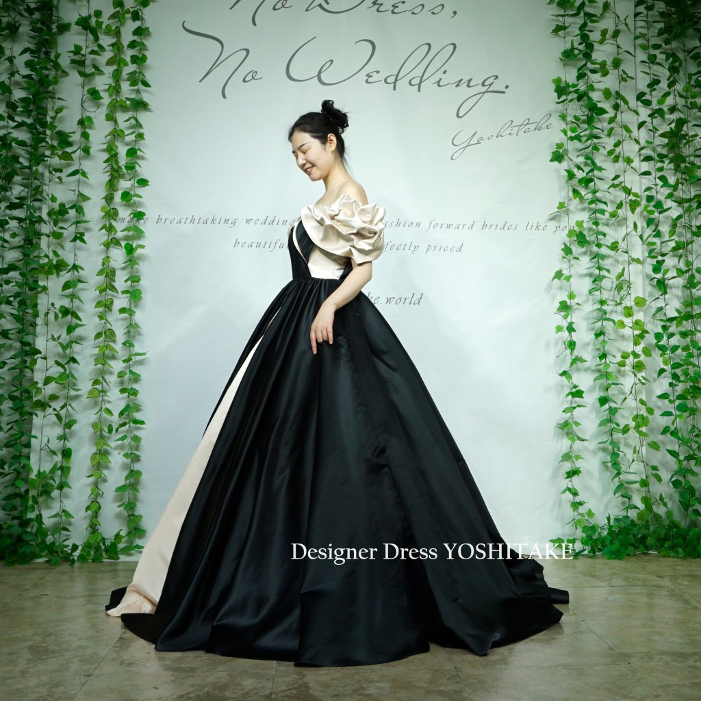 深みのある黒と柔らかなアイボリーのコントラストが特徴のドレスです。