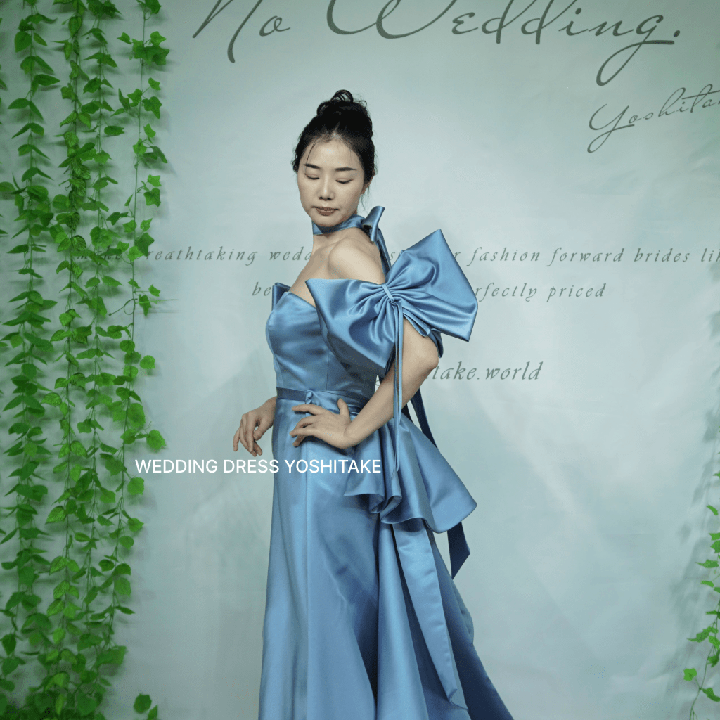 淡いブルーがエレガントで現代的な雰囲気を引き立て、背中を包み込むトレーンが美しく広がり、優雅な雰囲気を演出します。