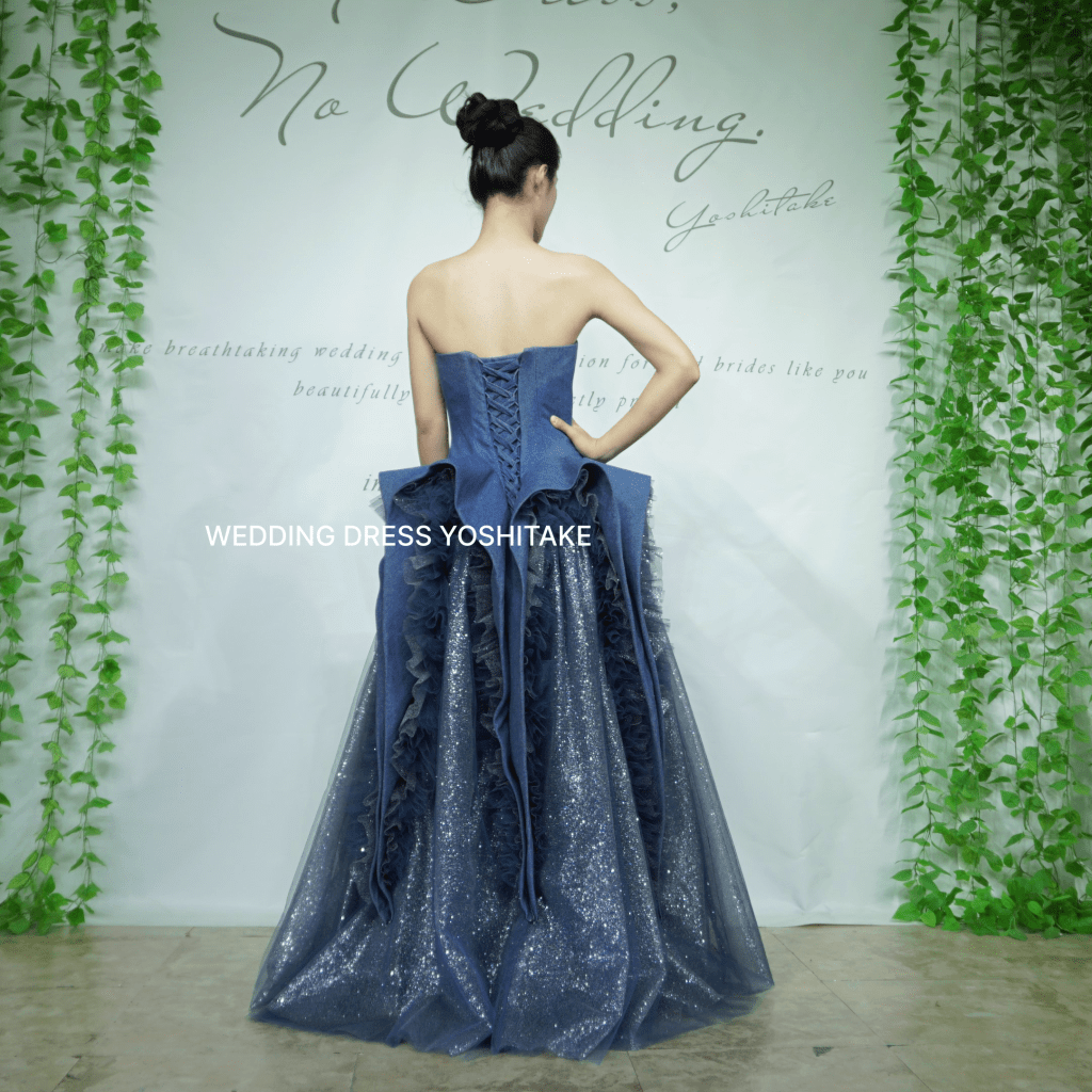 ブルーデニムと繊細にきらめくラメチュールを絶妙に組み合わせたドレス。