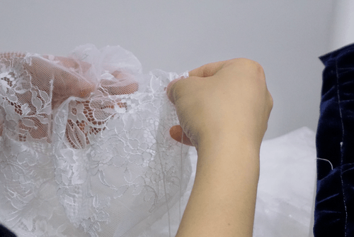 一つ一つ丁寧に縫い付ける事により、ドレスをより美しく豪華に見せる事が出来ます。