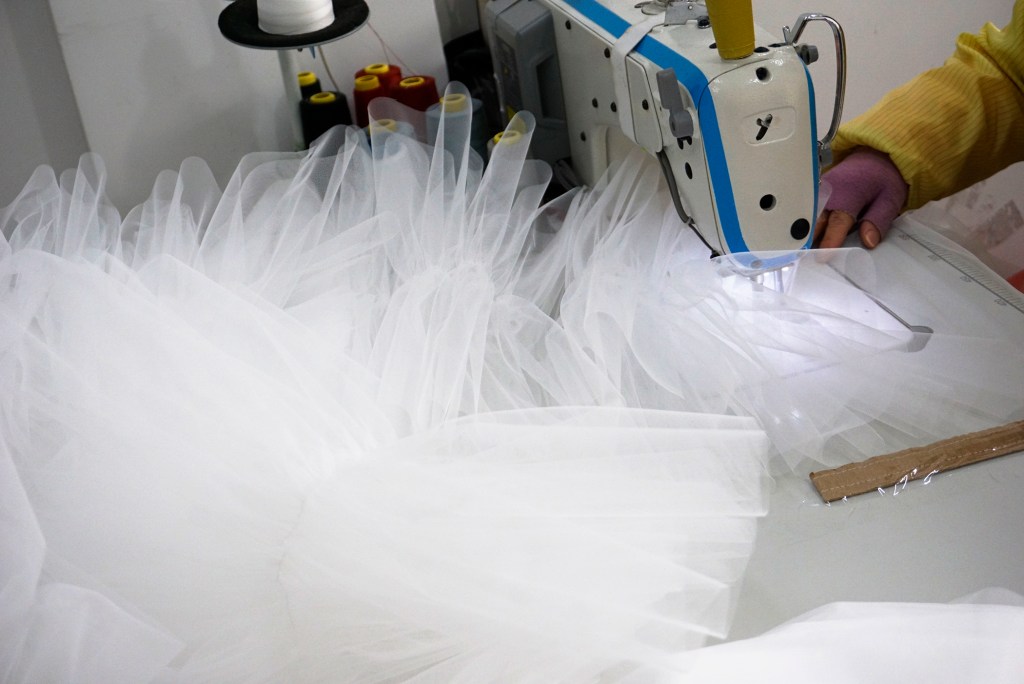 チュール生地でフリルを作っている所です。