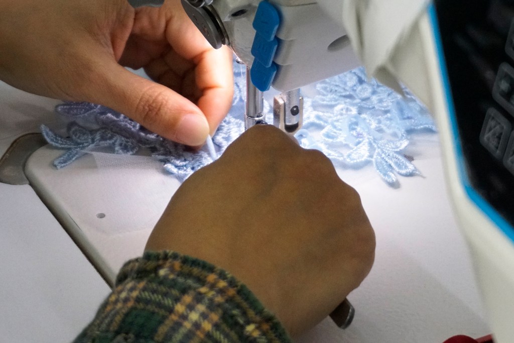 レースもチュール生地も傷みやすい繊細な生地、細心の注意を払って作業をすすめています。