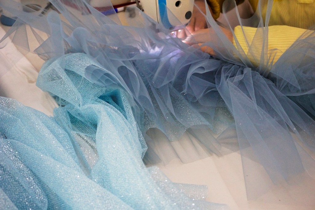 ギャザーを寄せた華やかなラメチュールと通常のチュール生地を重ね合わせ、フリルを作っています。