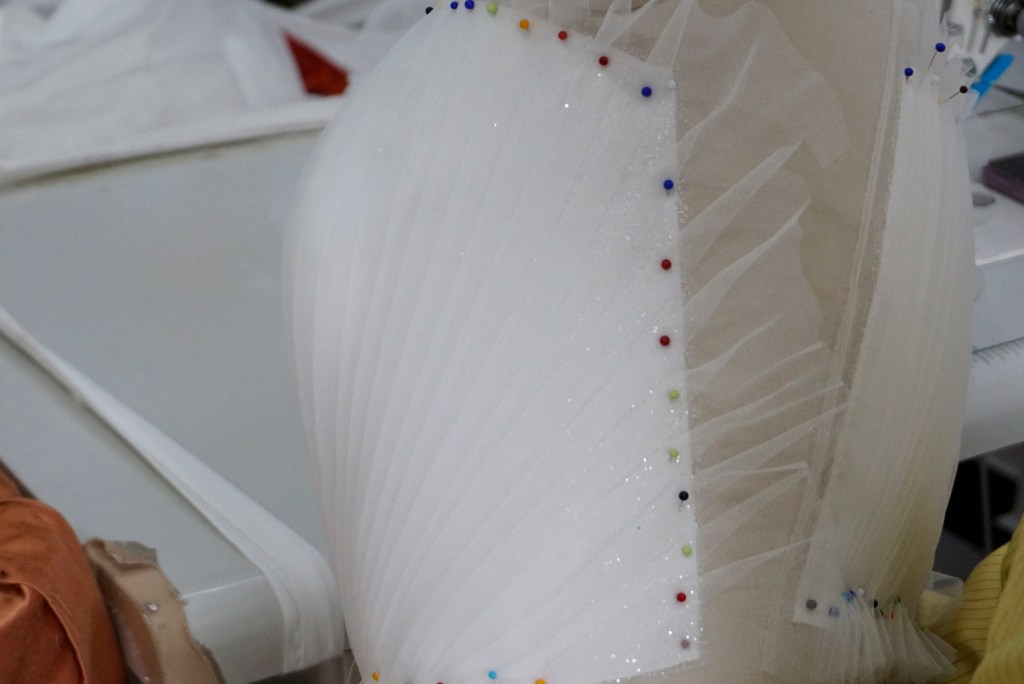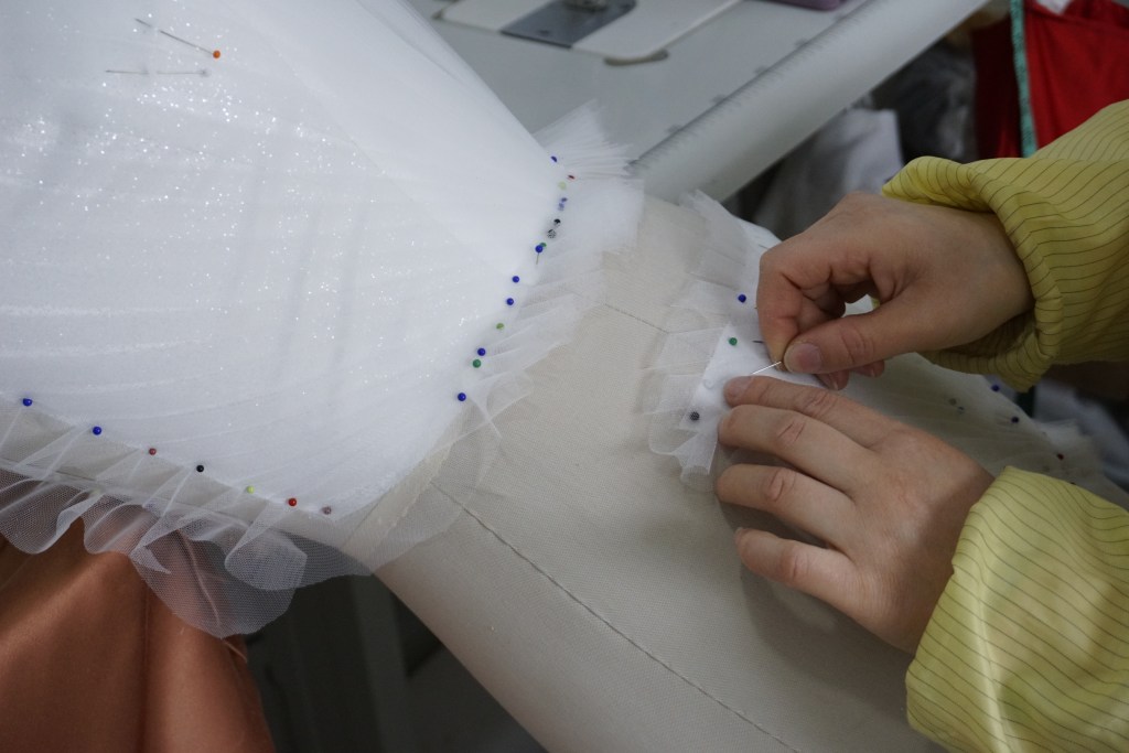 布の端をピンで止め、バストラインに沿うように立体的かつ、均等に折り目を入れています。