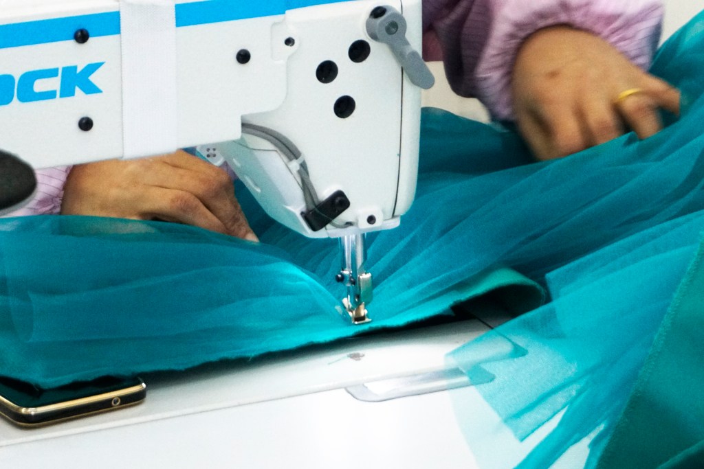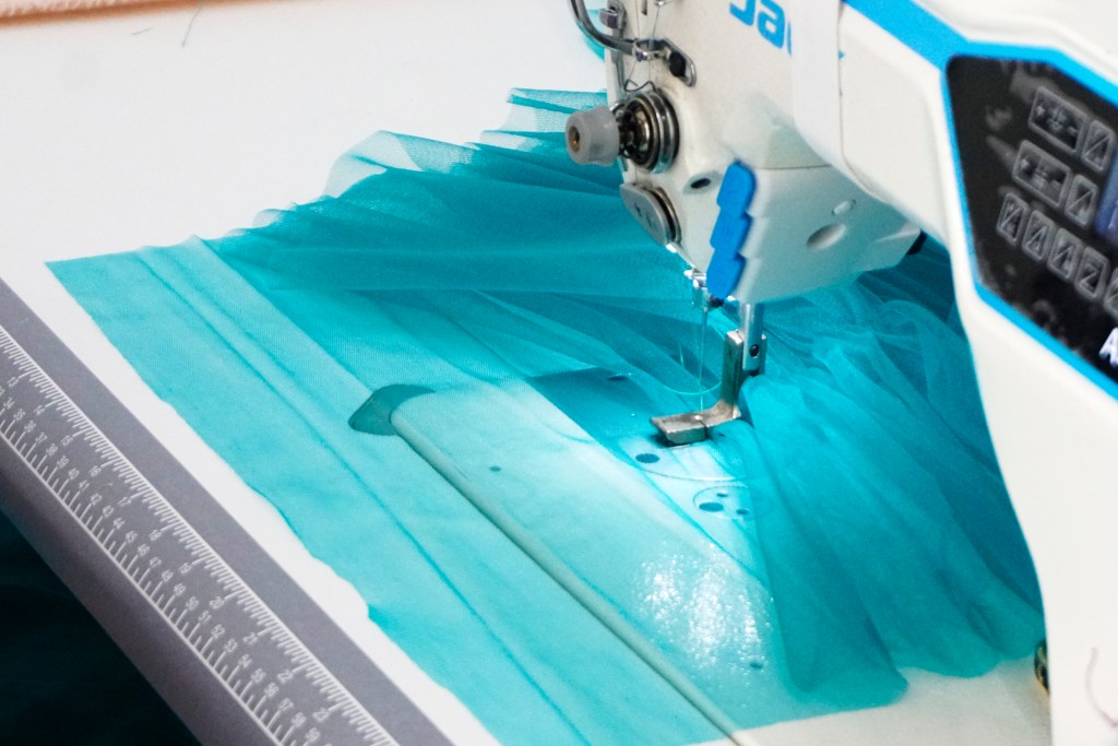 今日は鮮やかなエメラルドブルーのチュールドレスを制作している所です。