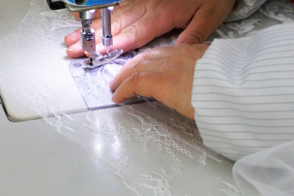 本日は繊細なレース生地に刺繍モチーフを縫い付ける作業を行っています。