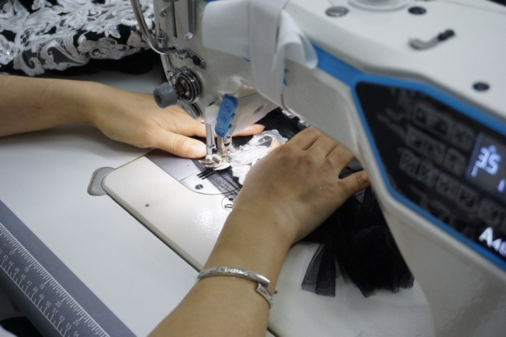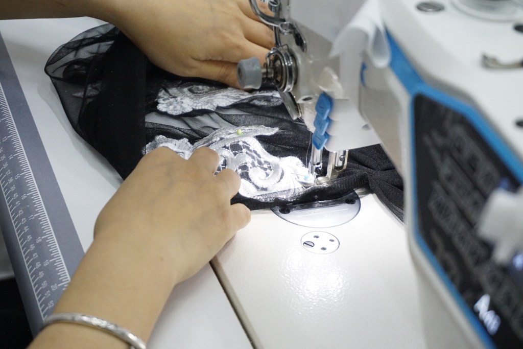 シックな黒に白の刺繍レースを縫い付け、華やかさアップ。
