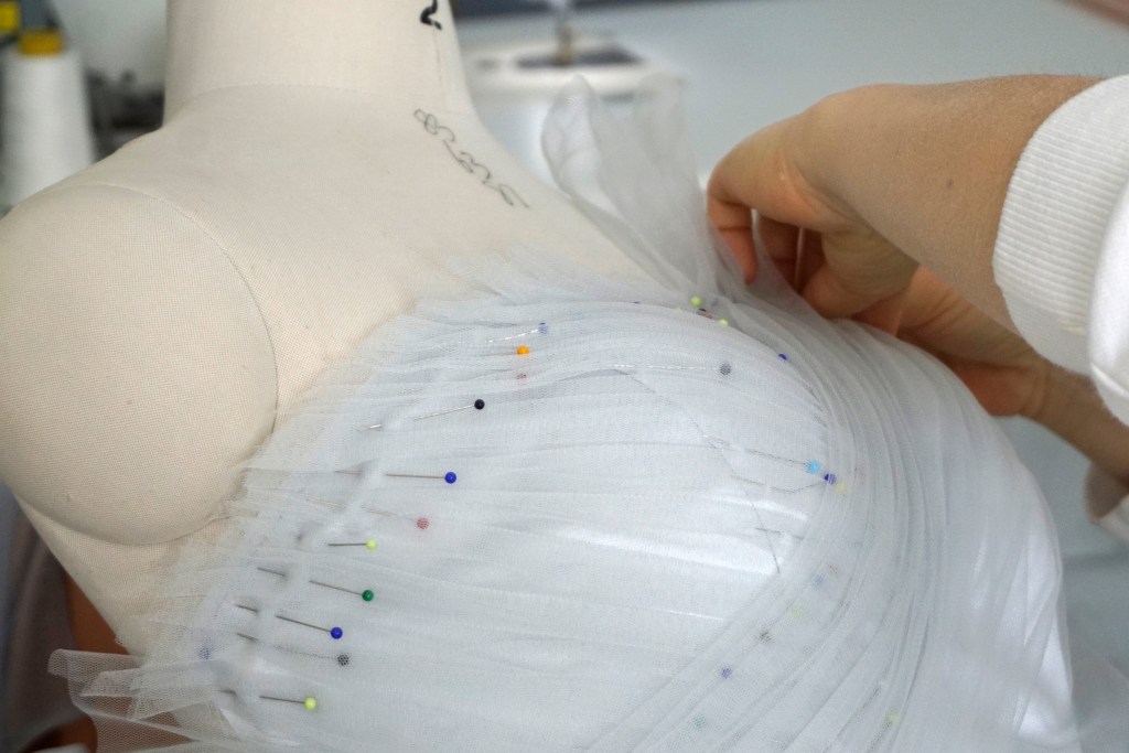 手作業で丁寧にプリーツを作り、ピンで細かく仮止めします。