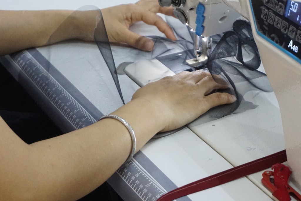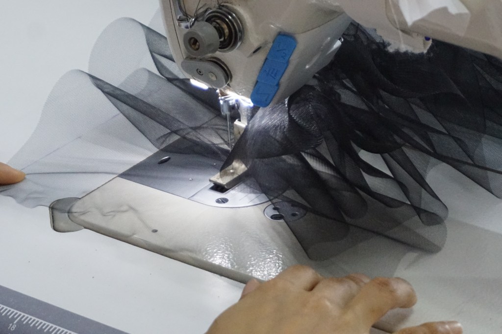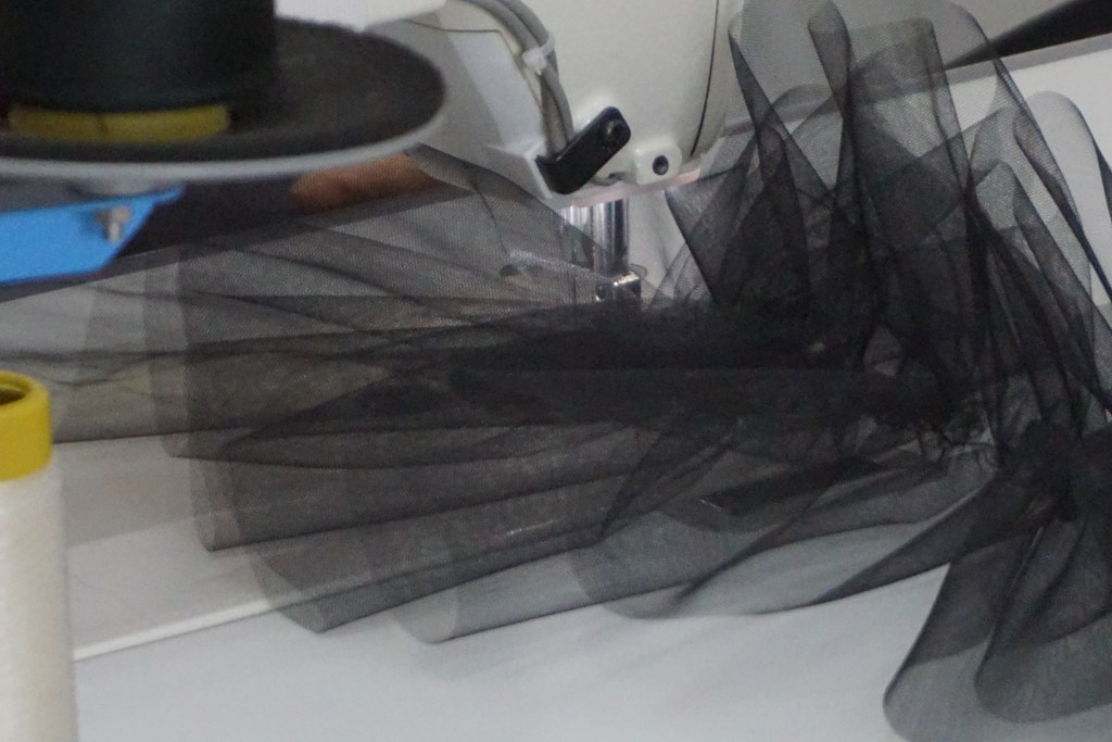 写真では、チュールに自然なフリル感を持たせるために、生地を美しく波打たせながらミシンで縫い合わせています。