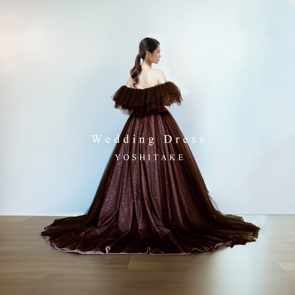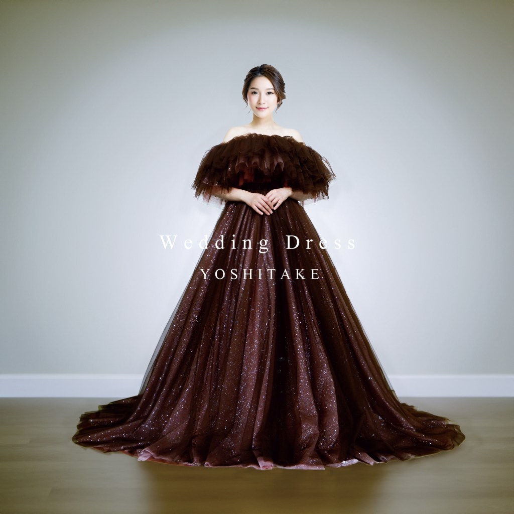 柔らかなチュールが生み出す華やかさと、落ち着きあるシックなブラウンの色味が絶妙に調和したドレス。