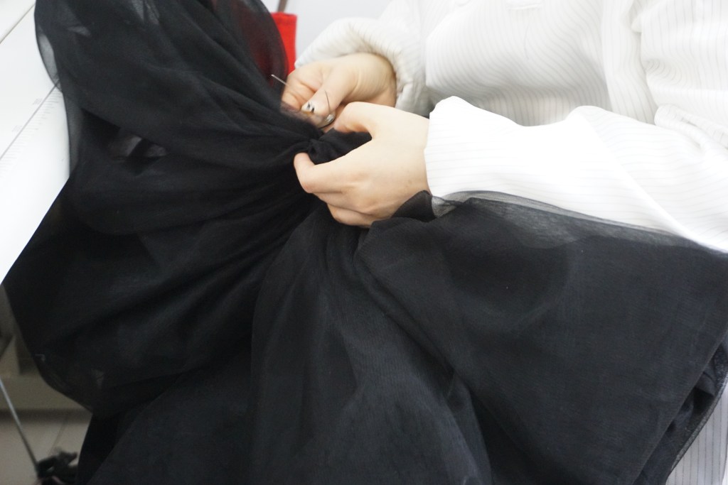 柔らかく繊細なチュールをまとめ、形を崩さないよう注意しながら、リボンの中心部分に金具を縫い付けました。