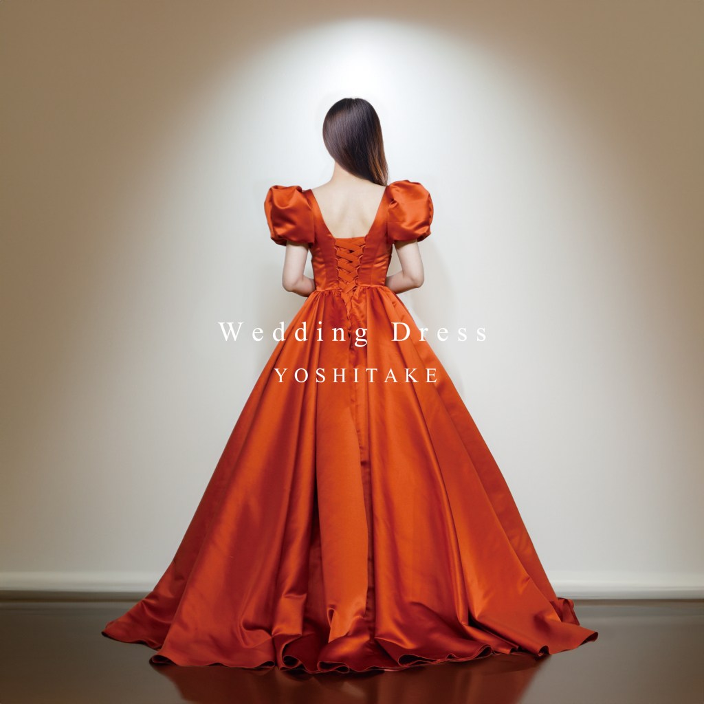 ツヤのあるオレンジサテンが存在感を放ち、ふわりと広がるスカートで華やかさも満点。