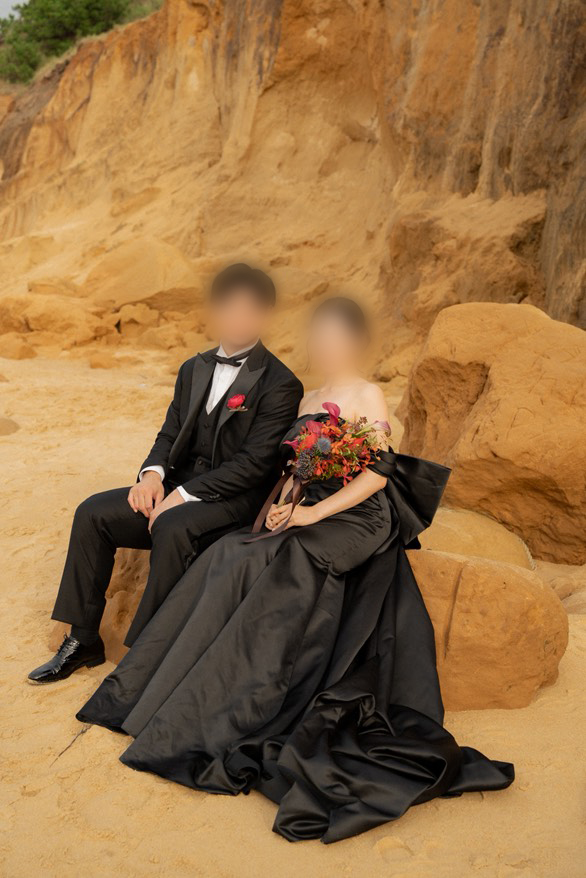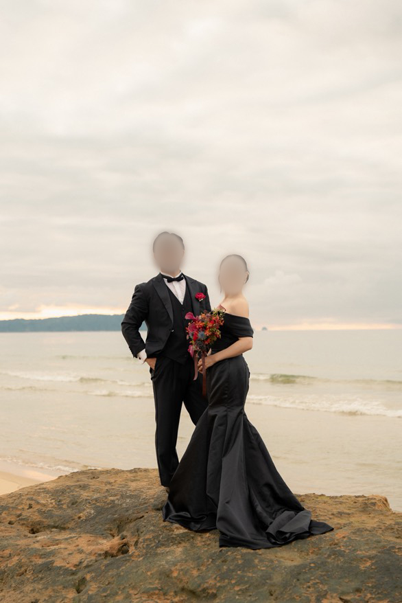 シックなブラックドレスが海の景色にもぴったりで、とてもお似合いです。