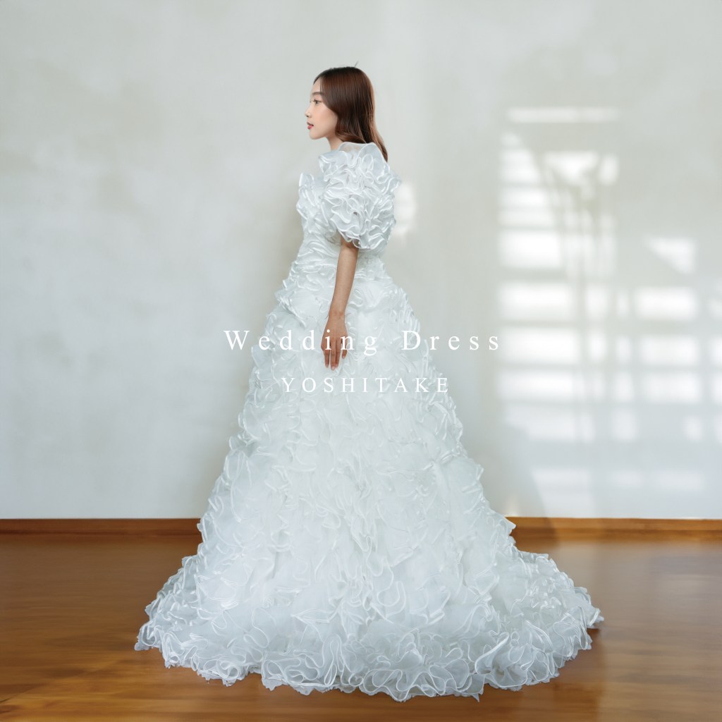 花びらをまとったような立体的なフリルが、やわらかく広がる印象的なドレス。