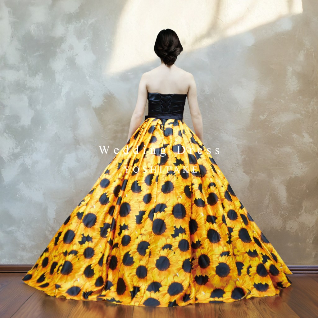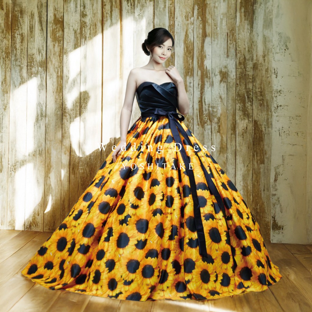 スカートいっぱいに咲き誇る大胆なヒマワリ柄が、歩くたびにドラマティックに揺れ動きます。