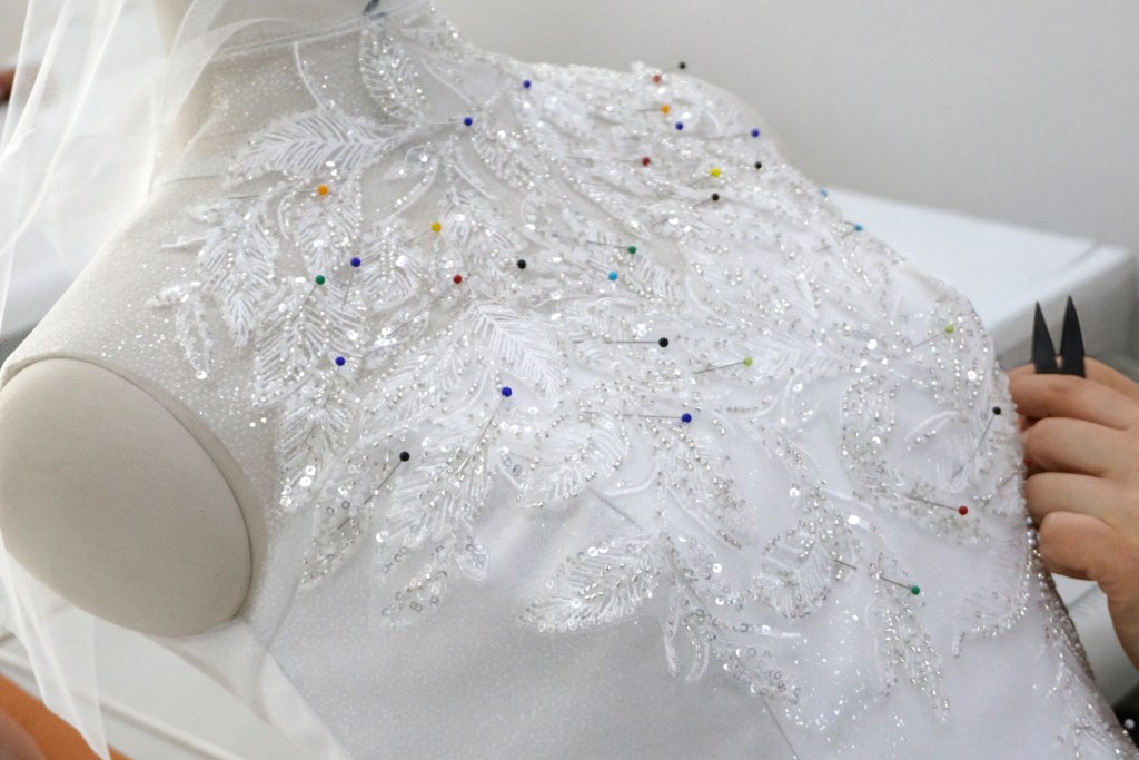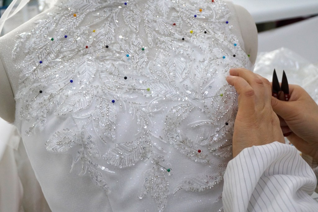 こちらは、ビーズとスパンコールをあしらったレースをドレスに配置し、ピンで丁寧に仮止めしている工程です。
